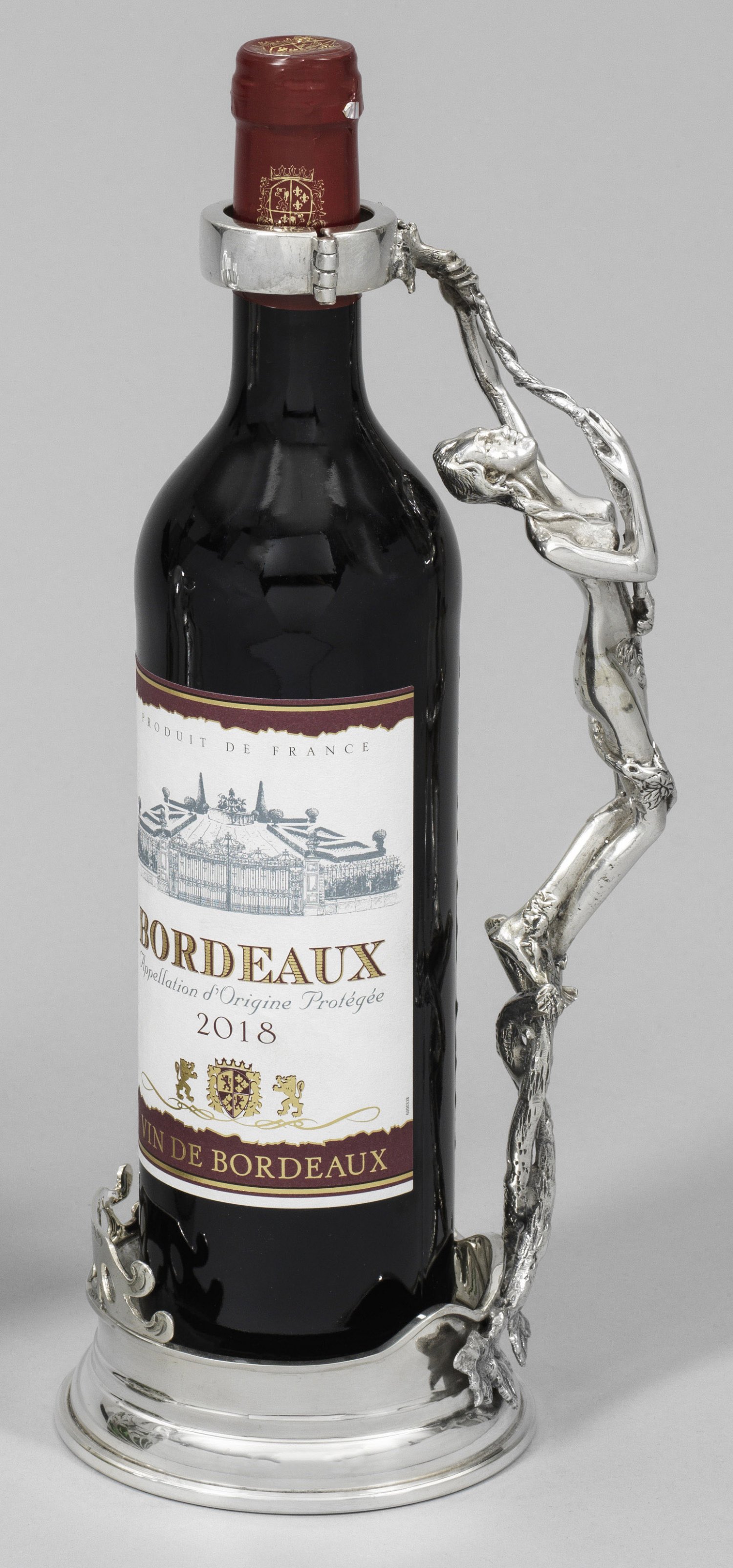 Silber. Von rundem Sockel aufsteigender, vollplastisch gearbeiteter Griff in Gestalt einer unbekleideten Dame, an einer Weinrebe emporsteigend. Dazu eine Flasche Bordeaux, 2018. Gest. 925. Gew. ca. 560 g. H. 29,5 cm.