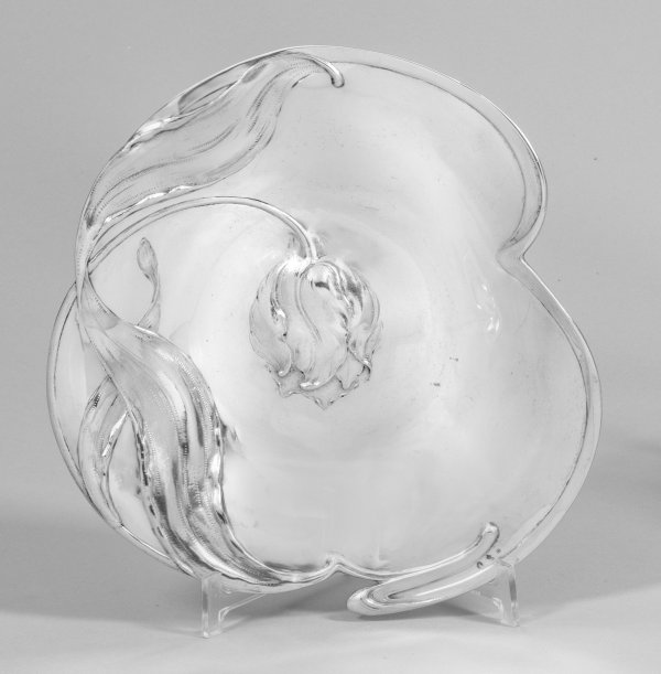 Silber. Dreiseitig geschweifte und gemuldete Schale über flachem, rundem Stand. Glatte Wandung, verziert mit reliefplastisch gearbeitetem, vegetabilem Dekor, übergehend in zentrale Darstellung einer großen Tulpenblüte mit wellenförmigen Blättern. Minim. best.; Gest., Stadtmarke, Beschauzeichen, Herstellerzeichen. Gew. ca. 355 g. H. 4,5 cm. D. 28 cm.