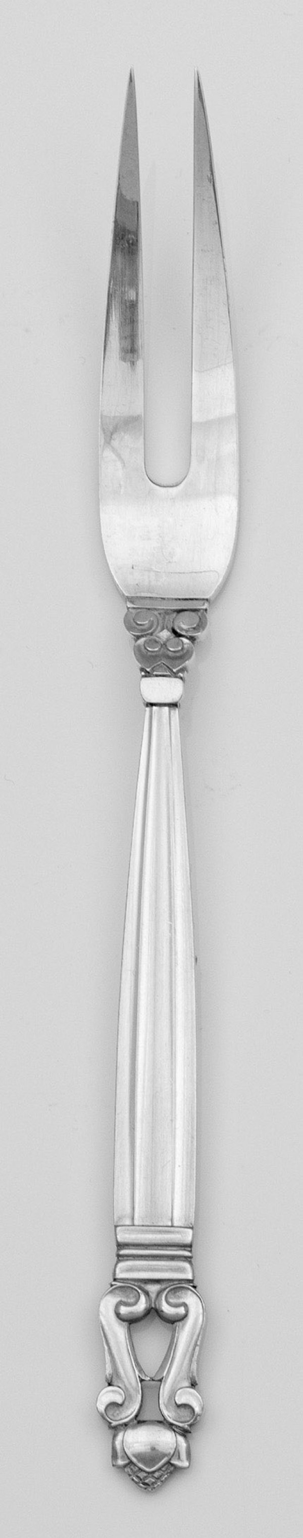 Silber. Zwei spitz zulaufende Zinken. Vom reliefplastischen Ansatz in Form von Blütenknospen übergehend in sich konisch erweiternden, kannelierten Griff mit Knospenbekrönung. Modell "Acorn". Entw. Johan Rohde, 1915. Gest. Sterling, Herstellerzeichen. Gew. ca. 55 g. L. 20 cm.