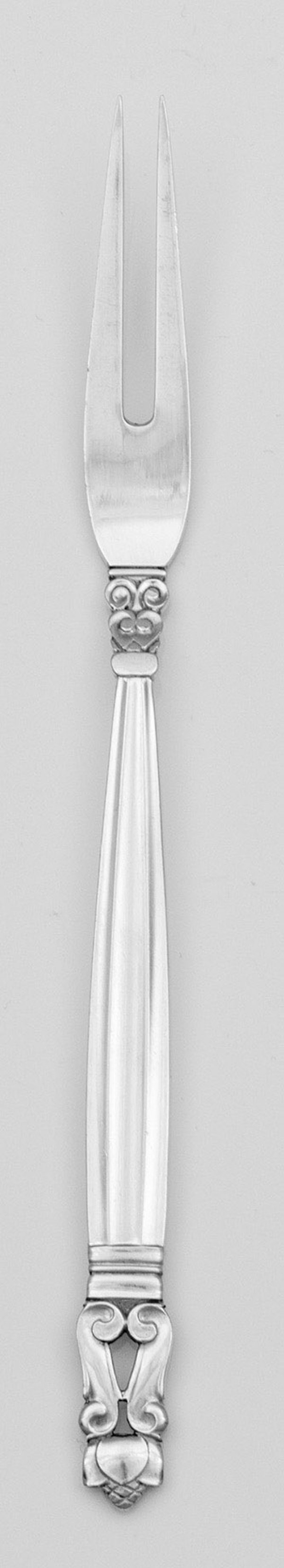 Silber. Zwei spitz zulaufende Zinken. Vom reliefplastischen Ansatz in Form von Blütenknospen übergehend in sich konisch erweiternden, kannelierten Griff mit Knospenbekrönung. Modell "Acorn". Entw. Johan Rohde, 1915. Gest. Sterling, Herstellerzeichen. Gew. ca. 26 g. L. 16,5 cm.