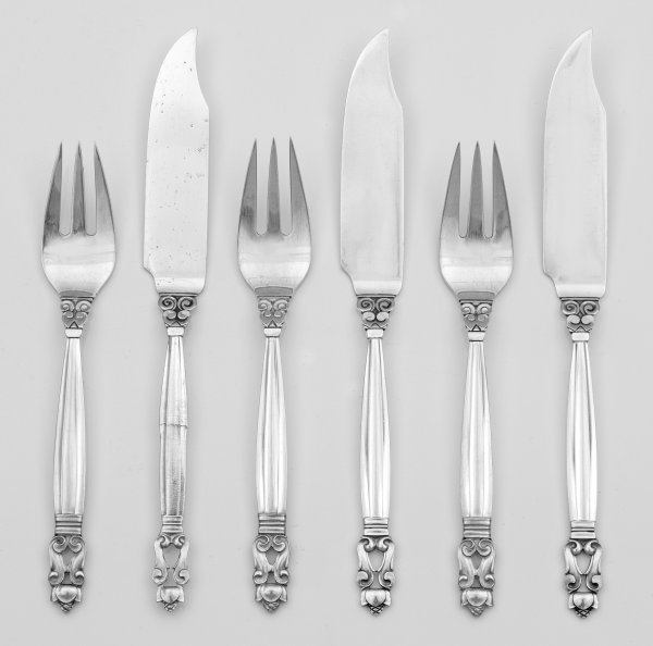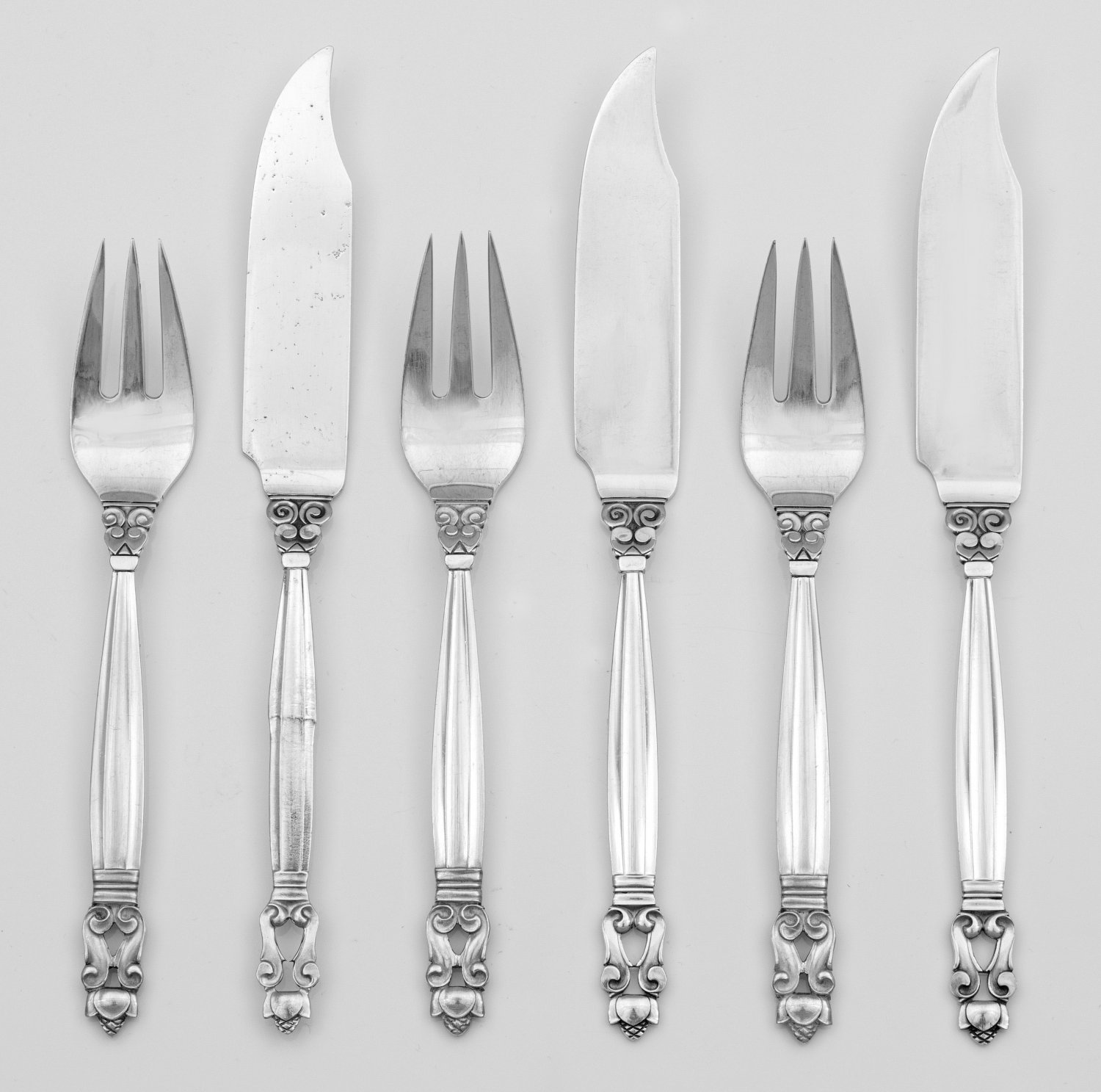 Silber. 12-tlg.; 6 Fischmesser, 6 -gabeln. Kannelierter Griff, übergehend in durchbrochen gearbeitetes Heft mit reliefplastischem Knospendekor. Modell "Acorn". Entw. Johan Rohde, 1915. Minim. Gebrauchsspuren. Gest. Sterling, Herstellerzeichen. Gew. zus. ca. 630 g.