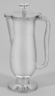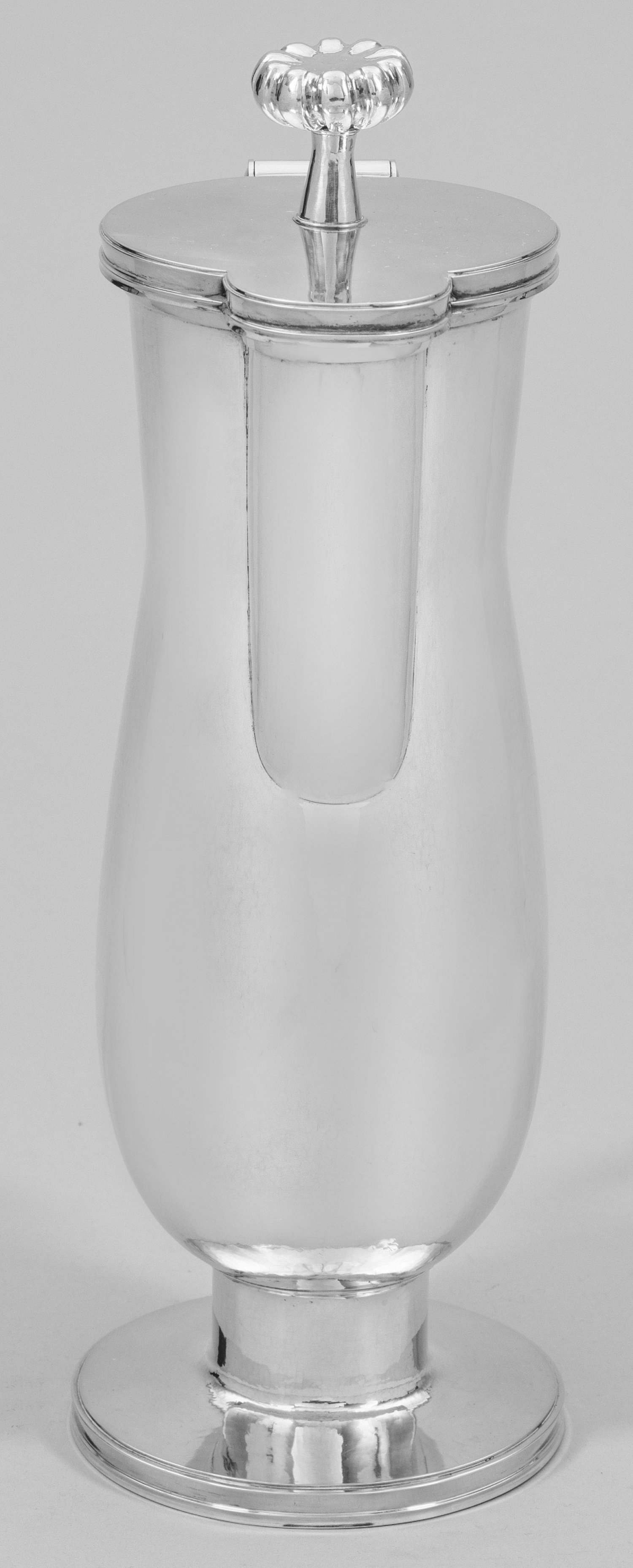 Silber. Über rundem, randprofiliertem Stand schmaler, kurzer Schaft, übergehend in schlichten, konischen, leicht gebauchten Korpus. Die Wandung flächendeckend umzogen von feinem Hammerschlagdekor. Flacher Scharnierdeckel mit leicht getrepptem Rand. Tief angesetzter, breiter Ausguss. Obenauf ein sich konisch verjüngender Schaft mit gedrückt bauchigem, durch vertikale Godronen gegliedertem Knauf, an eine stilisierte Blüte erinnernd. Passig geschweifter, auf der Oberseite kantiger, massiver Bandhenkel. Minim. best.; Gest. 900, Herstellerzeichen "H". Gew. ca. 1465 g. H. 35 cm.