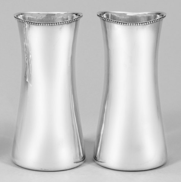 Silber. Über rundem Stand sich verjüngender, zum Rand hin oval weitender, glatter, zart martellierter Korpus. Schmaler, gering ausgestellter Lippenrand, umzogen von feinem Perlband. Minim. Gebrauchsspuren. Gest., Stadtmarke, Jahresmarke "M 9 ", Herstellerzeichen. Gew. zus. ca. 605 g. H. 18 cm.