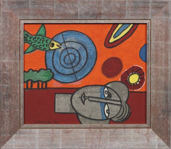 Farbserigraphie/Lwd., 1998. Sign. u. dat.; Verso nummeriert 9/85. Phantasievolle, expressive, durch starkfarbige Flächigkeit und schwarze Konturen bestimmte Arbeit des Künstlers, der mit Pierre Alechinsky, Karel Appel, Constant, Asger Jorn und K. O. Götz zur legendären, 1948 - 1951 bestehenden Avantgarde-Künstlergruppe "CoBrA" gehörte. Corneille war Teilnehmer der documenta II und III (1959 und 1964) in Kassel. 33 cm x 40 cm. Rahmen.