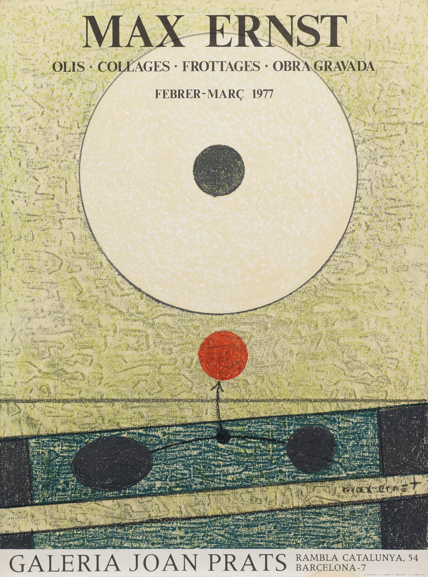Offset lithograph in colours as poster for the Max Ernst exhibition in the Galerie Joan Prats, Barcelona, 1977. Printed by La Poligrafa in Barcelona. Minor light toning to the lower edge.