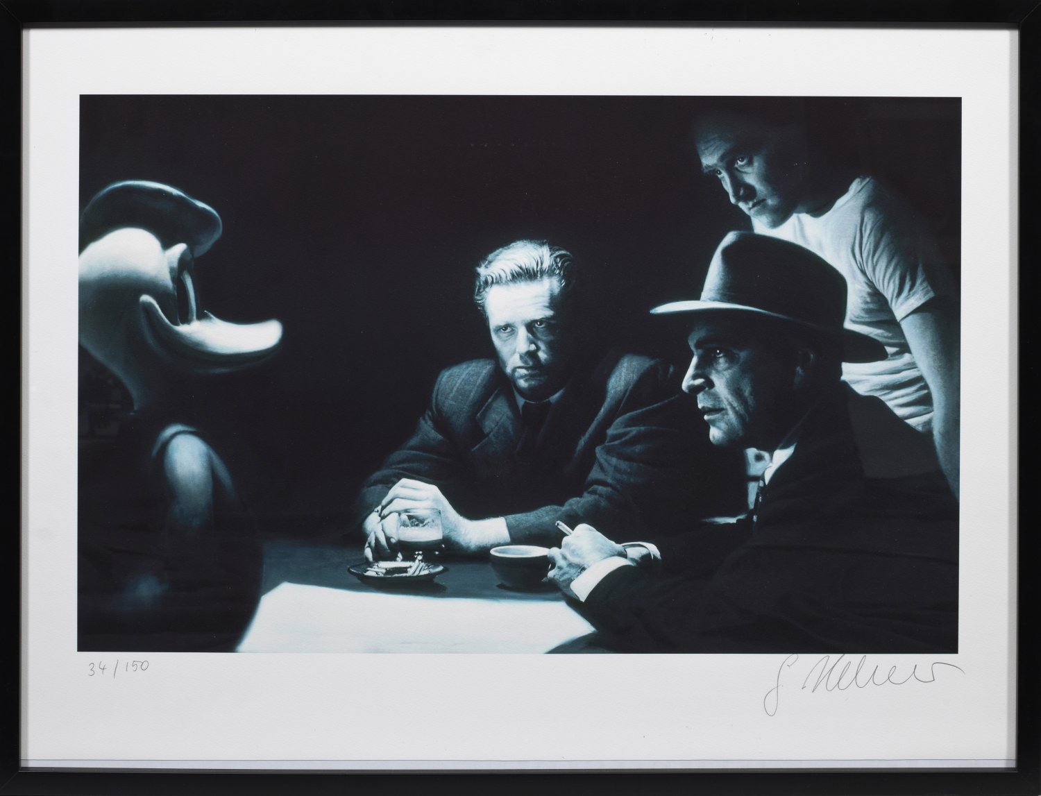 Farbiger Fine Art Print/Papier, 2003. Sign. u. nummeriert 34/150. Nach dem gleichnamigen Gemälde von 2003, bei dem Gottfried Helnwein im Stil der "Film noir"-Hollywood-Gangsterfilme der 1940er/50er Jahre drei zwielichtige Gestalten mit Donald Duck verhandeln lässt. Helnwein - ein großer Fan von Donald Duck und seinem Zeichner Carl Barks - verbindet hierin zugleich ikonische Motive der Pop-, Film- und Comic-Kultur. Darstellung 44 cm x 70 cm; Blatt 58 cm x 80,5 cm. Rahmen.