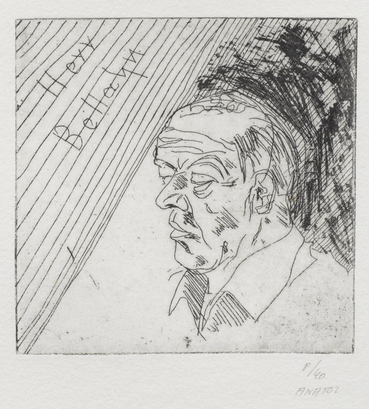 Radierung/Papier. Sign. u. nummeriert 8/40. Grafik des vor allem als Bildhauer bekannten Künstlers, der bei Beuys studierte und mit ihm Kunstaktionen durchführte. Anatol war Teilnehmer der documenta 5-7 in Kassel (1972-1982). Plattenmaß ca 10 cm x 10 cm. Rahmen.