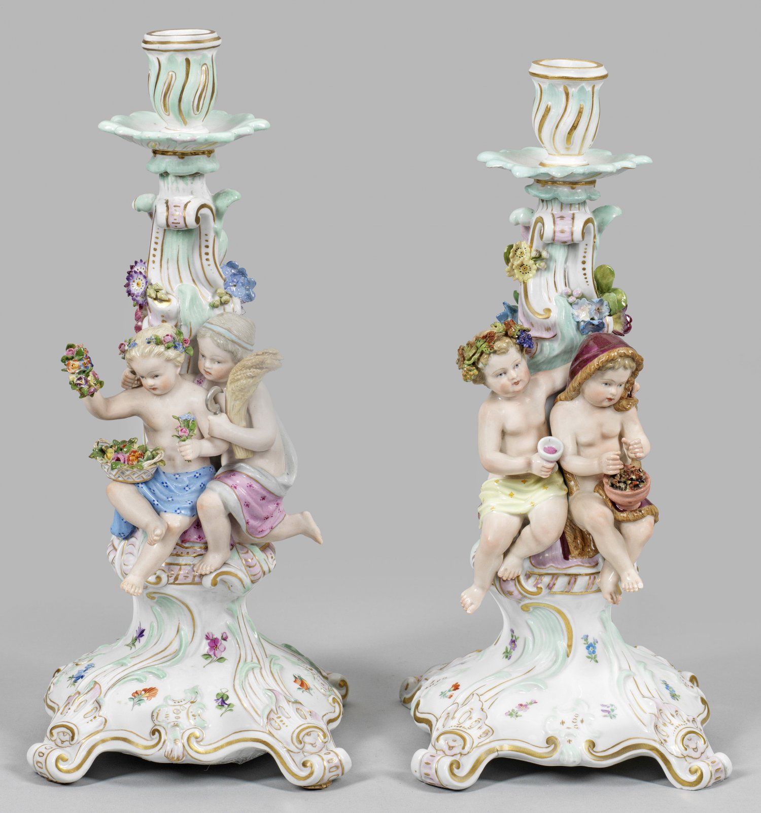 A pair of figural candelabras with allegories of the four seasons. Insignificantly restored. Crossed swords mark.