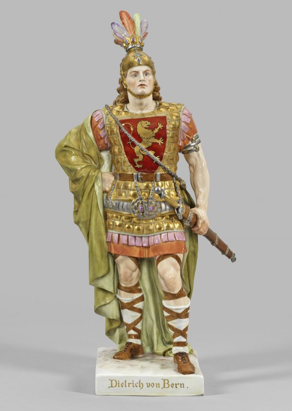 Effektvoll-pathetisch ausgeformte Figur des germanischen Sagenheldes, entworfen von dem Bildhauer und Porzellanplastiker Emmerich Andresen (1843 - 1902), der in Hamburg bei Ernst Gottfried Vivié und an der Dresdner Kunstakademie unter Ernst Julius Hähnel studierte. Der für Bronze- und Marmorskulpturen sowie Denkmäler in Dresden, Meißen und Tübingen bekannte Andresen schuf zahlreiche Skulpturen im klassisch-realistischen Stil, die einen Hang zur monumentalen Plastik erkennen lassen. Neben allegorischen Figuren, Porträtbüsten oder Soldatengruppen wandte sich Andresen Themen der nordischen bzw. germanischen Mythologie und Sagenwelt zu. In ähnlich ausdrucksstarker Weise entstanden in den 1880er und 1890er Jahren für die Meissener Manufaktur neben "Dietrich von Bern" auch die Figur des "Wodan" (bzw. Odin), "Hermann" oder der "Thusnelda".