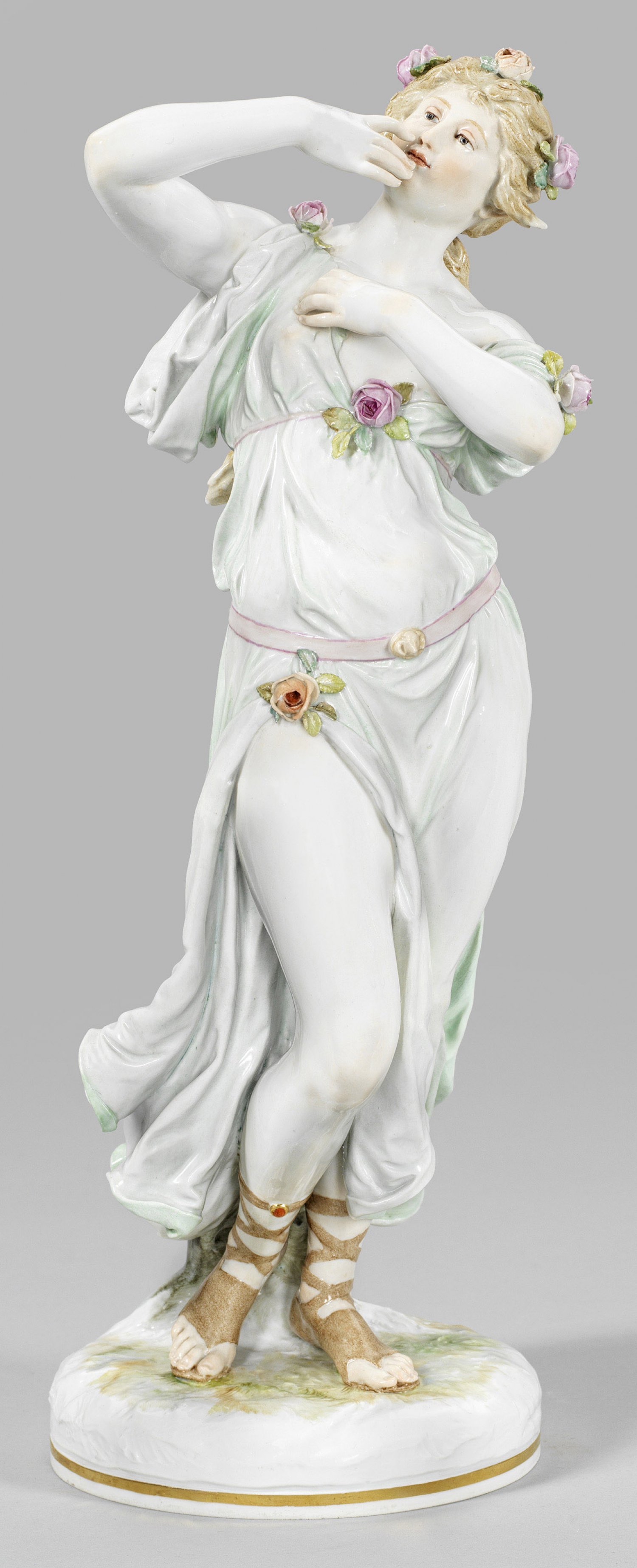 Auf einem naturalistisch gestalteten Rundsockel, im Kontrapost stehende antikisierende junge Frau in kokettierender Tanzhaltung, gekleidet in ein dünnstoffiges, locker drapiertes, ihre Gestalt umschmeichelndes Gewand. Das lange, gewellte, hellbraune Haar ist im Nacken geknotet. Gewand und Haar sind von plastisch aufgelegten Rosen geschmückt. Die rechte Hand führt sie zum Mund, während die Linke auf dem Dekolleté ruht. Polychrome Malerei in dezent-zarten Pastelltönen. Goldrand. Entw. Johann Christian Hirt, 1884. Entw.-Bez.; Modell-Nr. N 163. Minim. best./rest.; Schwertermarke. H. 43 cm.