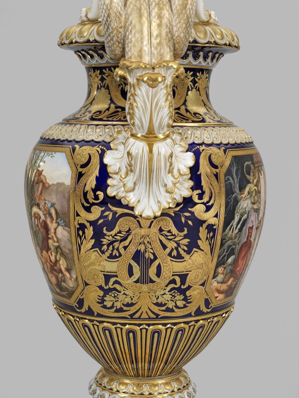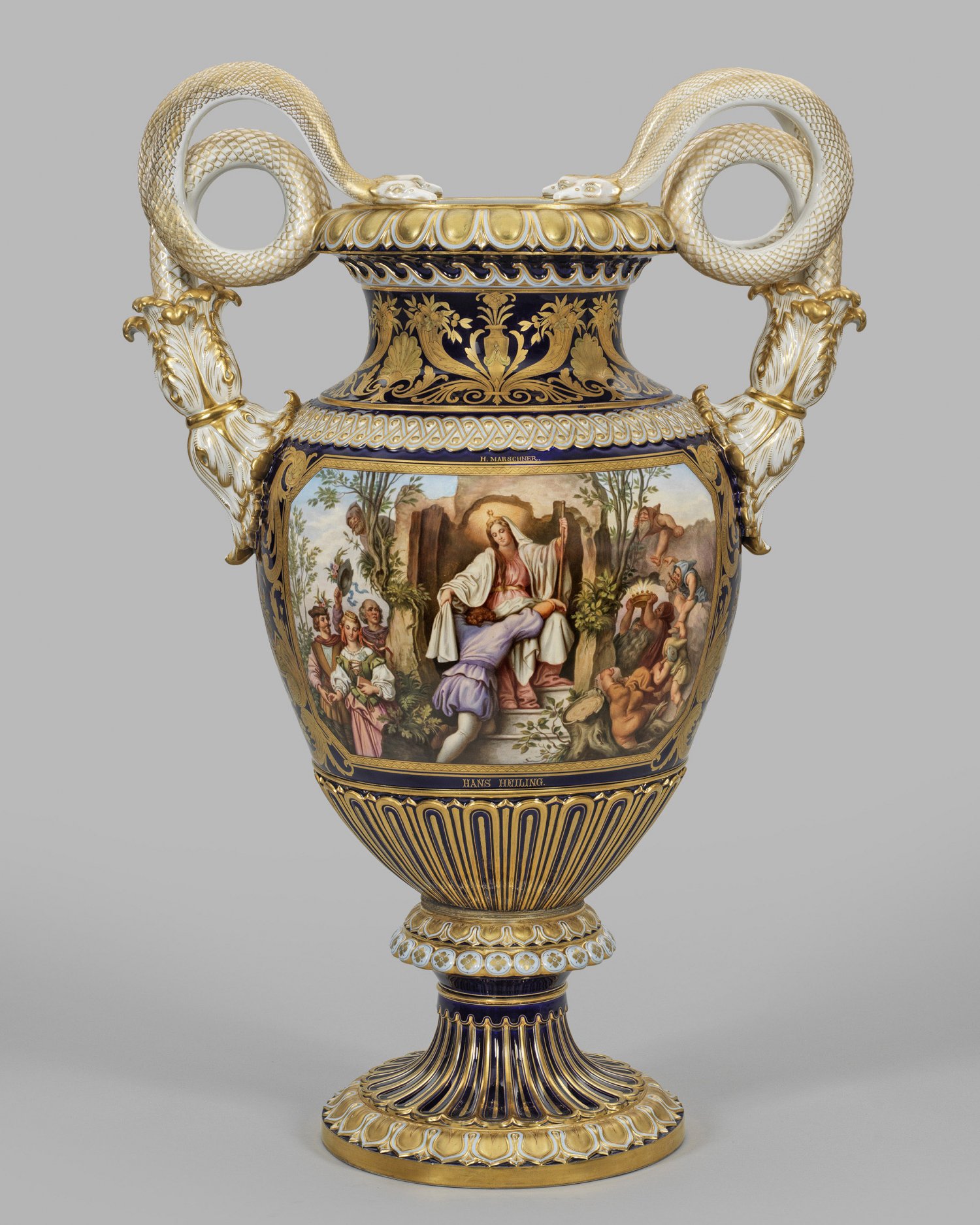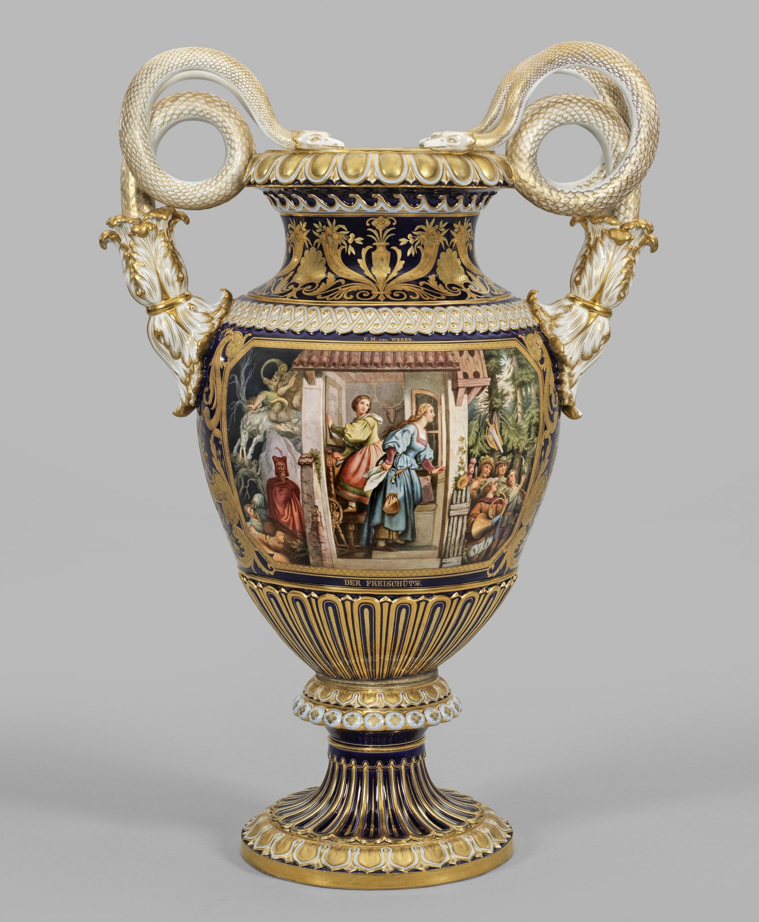 Über hochgezogenem Rundfuß mit Nodus ovoider Korpus mit eingezogenem Hals, in weit ausschwingenden Rand übergehend. Von der gerundeten Schulter aus stark reliefplastischen Akanthusblättern aufsteigende, gewundene Schlangenhenkel. Beidseitig der Wandung, in kobaltblauem Fond ausgesparte, großflächig angelegte und von achteckiger, goldener Chevronbordüre gerahmte Darstellungen von drei Szenen aus den berühmten romantischen Opern Hans Heiling von Heinrich Marschner bzw. Der Freischütz von Carl Maria von Weber nach den Lünettengestaltungen des österreichischen Malers Moritz von Schwind im sog. Schwindfoyer der Wiener Staatsoper. Die Decken- und Wandgestaltungen sind zahlreichen berühmten Opernstücken von Marschner und Weber über Mozart, Beethoven, Schubert und Cherubini gewidmet. Äußerst feine, polychrome Malerei mit reicher Goldstaffage. Korpus umzogen von verschiedenen reliefierten Ornamentbordüren sowie reichem Ornamentdekor aus Lyra- und Vasenmotiven, umgeben von großen, gerollten Akanthusblättern, Füllhörner mit Früchten und stilisierten Muscheln in Matt- und Glanzgold mit feiner Binnenzeichnung. Entw. Ernst August Leuteritz. Bez.; Modell-Nr. A 195. Meissen. 2. Hälfte 19. Jh. Schwertermarke. H. 80 cm.