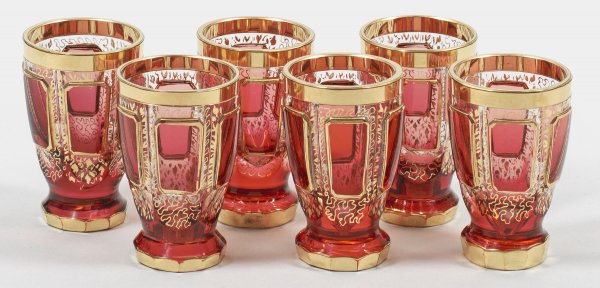 A set of six Czechoslovakian Bohemian Nový Bor Egermann cut, gold painted and pink-coloured panelled crystal shot glasses.