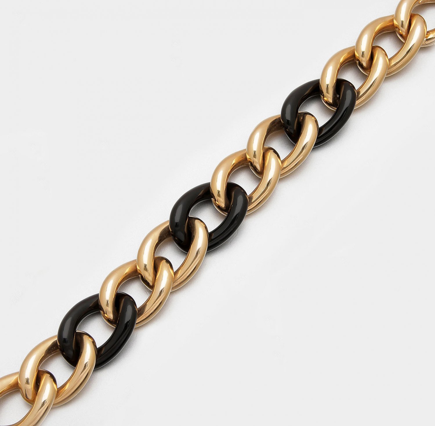 Gelbgold, gest. 750. Einreihiges Armband aus Panzergliedern, im dekorativen Wechsel mit schwarz emaillierten Gliedern. Sehr schöne Goldschmiedeausführung. Herstellerzeichen F.P.; Gew. ca. 47,04 g.