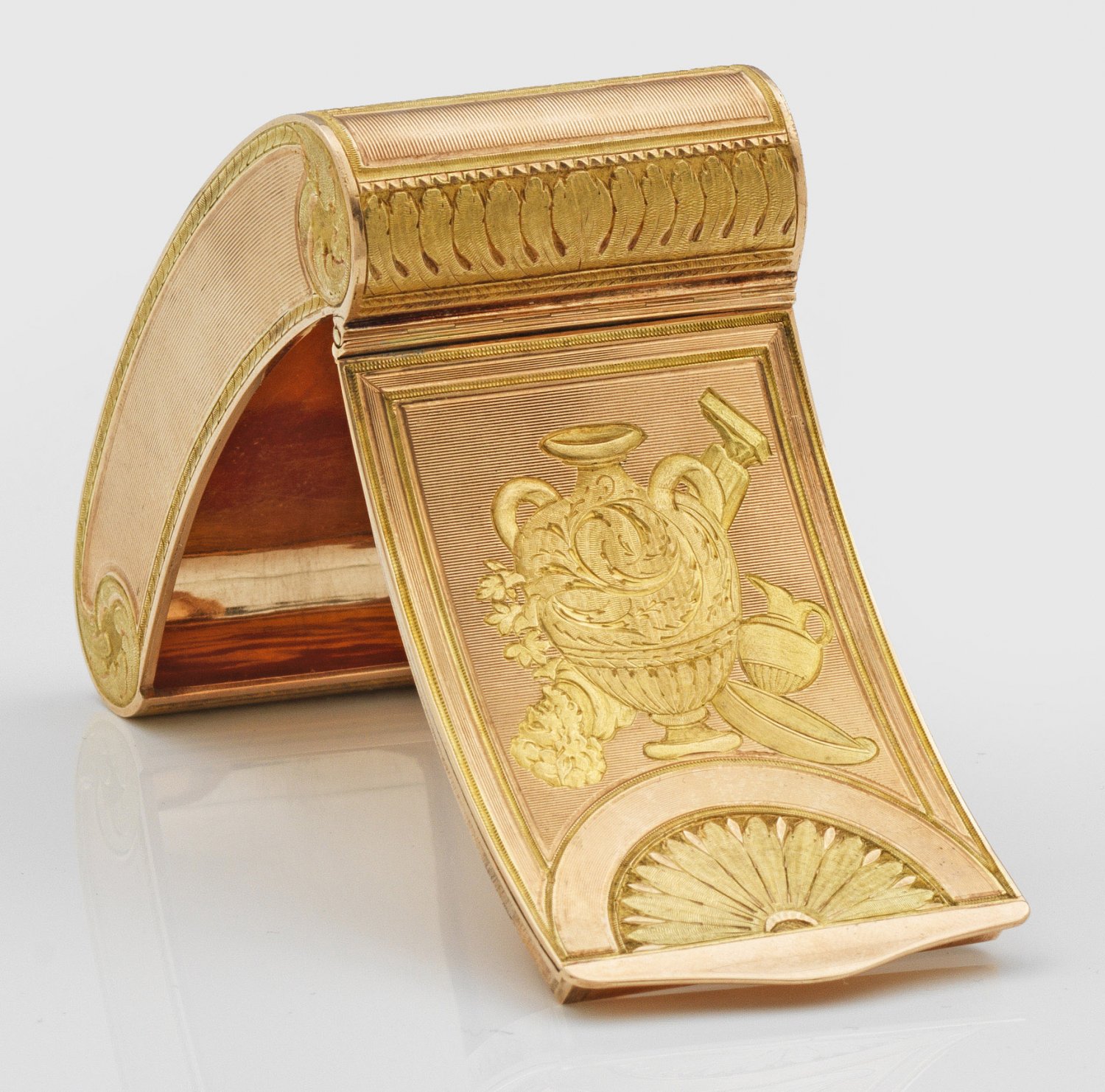 Gelb- und Rotgold, 18 ct.; Rechteckige Form mit gebogten Längskanten und hochgezogenen, gerundeten Kurzseiten. Scharnierter Deckel, übergehend in passig geschweiften, glatten Drücker. Auf dem gebogten Deckel eine großflächig dargestellte und äußerst filigran guillochierte Halbrosette. Darüber mehrere antikisierte Gefäße, in Form einer großen Henkelvase, einem Krug und einer Schale, sowie der Statue eines Faun mit Blattranken. Die Längskanten mit je zwei prächtigen Akanthusblattvoluten und Kordelband umzogen. Auf der Unterseite äußerst feiner, alternierend vertikal und horizontal verlaufender Guillochedekor, gerahmt von stilisiertem Blattfries, Blütenrosetten und Kordelband. Die Kurzseiten mit detailliert ausgearbeitetem und fein punziertem, reliefplastischem Akanthusblattfries verziert. Gest., zweifache Beschaumarke Julien Alaterre (verwendet 1768 - 1775), sowie "B". H. 2,5 cm. D. 6 cm.