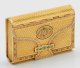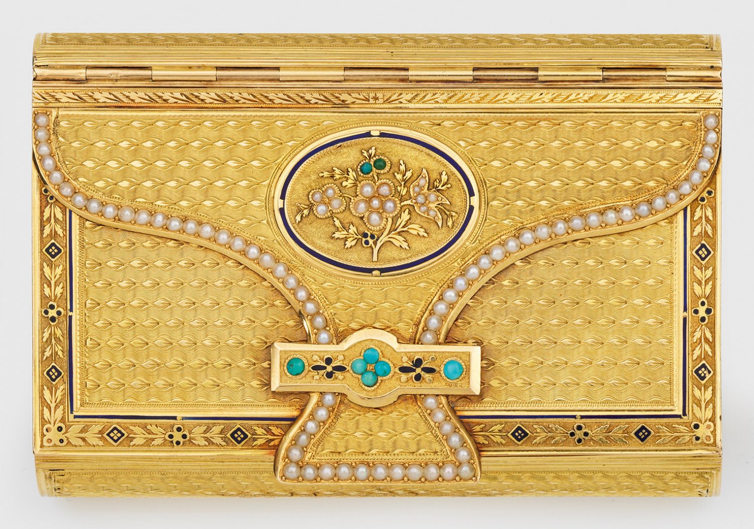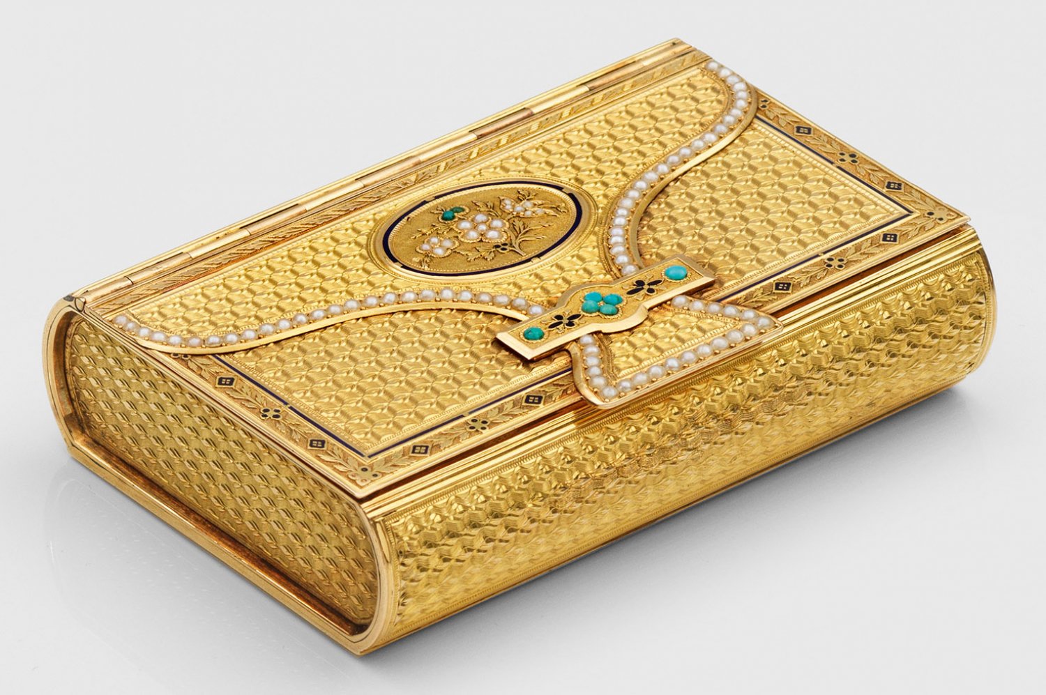 Gold, 18 ct; Rechteckig mit abgerundeten Längskanten. Auf dem flachen Scharnierdeckel eine stilisiert übergreifende Lasche mit Verschluss, die an die Vorderseite einer geschlossenen Tasche erinnert. Die Lasche abgesetzt durch ein zartes Band aus Halbperlen. Der Verschluss abwechselnd mit applizierten Türkiscabochons und emaillierten Blüten verziert. Zentrales, schildförmiges Medaillon mit Blütenzweig, applizierten Perlen und Türkisen. Die Wandung flächendeckend verziert mit feinstem Guilloche-Dekor, gerahmt von einem Ornamentband mit Blattranken sowie alternierenden, feinen, dunkelblau emaillierten Rauten und Blüten. Gest., französischer Garantiestempel, Herstellerzeichen, sowie ungedeutete Marke "T C"(?). Gew. ca. 80 g. H. 1,5 cm. 7 cm x 4,8 cm.