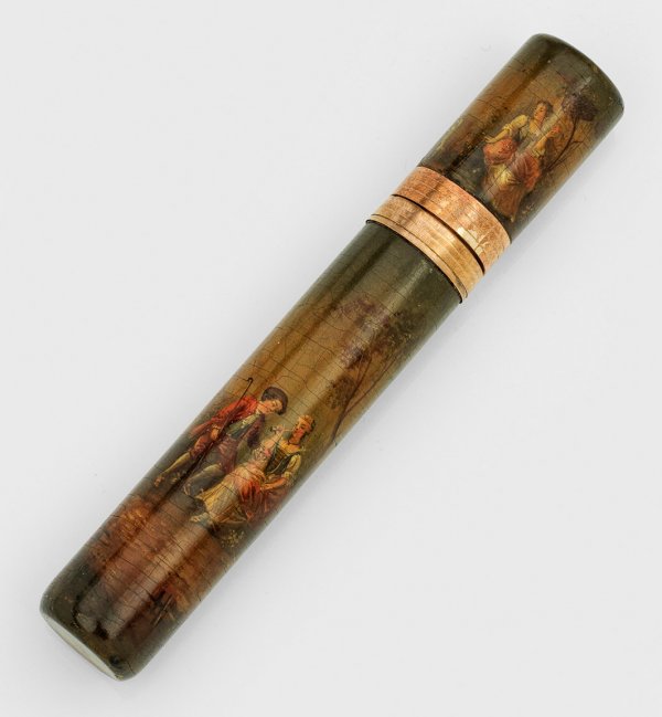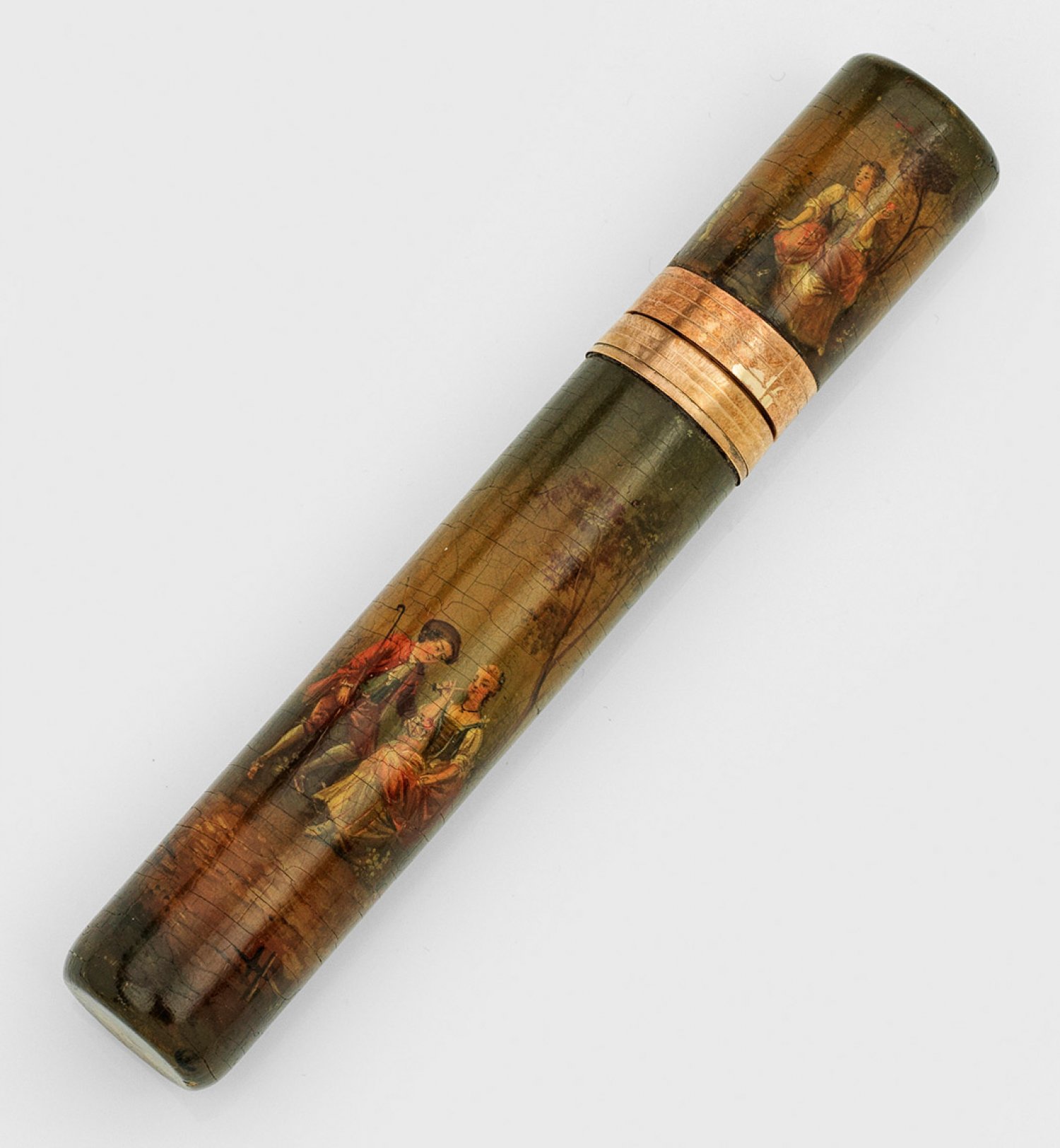 sog. "Étui à Message" oder "Étui à billet doux", für Liebesbriefe. Zylindrisches Etui mit vergoldeter, mehrfach profilierter Messingmontierung. Allseitig dargestellte, galante Szenerien in polychromer Lackmalerei. Auf dem Deckel ein Paar, mit einem weißen Hund spielend. Auf dem Korpus ein musizierendes Liebespaar vor weitläufiger, bewaldeter Landschaft mit Burgen im Hintergrund. Im Inneren Schildpatt. L. 15 cm. D. 2,5 cm.