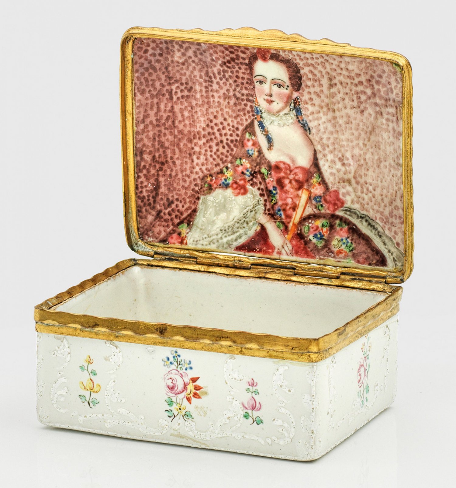 Fayence, weiß glasiert, mit vergoldeter Messingmontierung. Rechteckige Form mit leicht gewölbtem Deckel. Auf der Wandung flächendeckend erhabener Voluten- und Blüten- sowie zarter Streublumendekor. Im Innendeckel Bildnis einer Rokoko-Dame mit üppigem Rüschenkleid und Fächer in der Hand vor weinrotem, gepunktetem Hintergrund. Polychrome Malerei. Deckel wohl ergänzt. Altersbedingte Gebrauchsspuren, teilw. mit Haarriss. H. 4 cm. 8,5 cm x 6 cm.