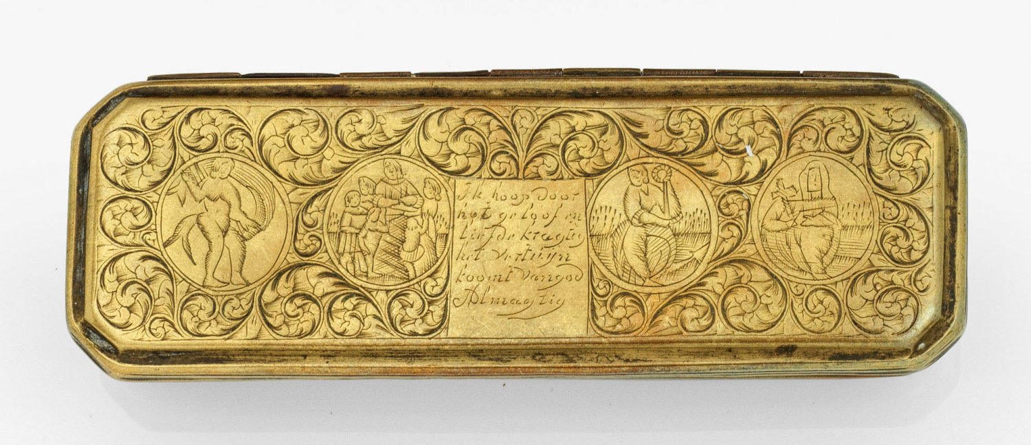 Messing und Kupfer, gravierter Reliefdekor. Mehrfach profilierte, eingezogene Wandung. Scharnierter Deckel und Unterseite verziert mit von volutierten Akanthusblattranken gerahmten Medaillons mit szenischen Darstellungen und Kartuschen mit holländischen Inschriften. Besch.; H. 3,5 cm. 14,5 cm x 5 cm.