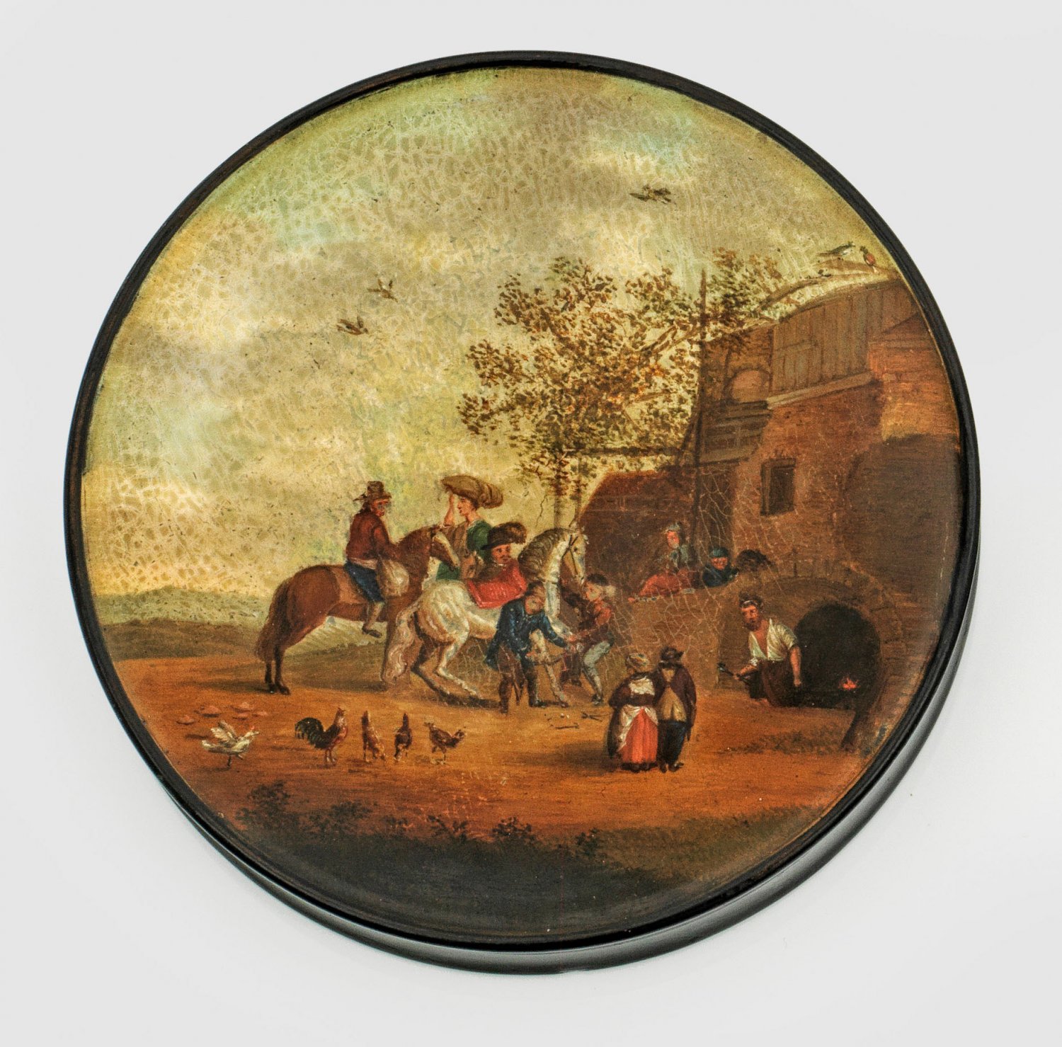nach Philipp Wouwermann (1619 - 1668) mit Figurenstaffage, zwei Pferden und Hühnern vor eine Hufschmiede. Im Hintergrund weite, baumbestandene Berglandschaft. Polychrome Lackmalerei. Innendeckel undeutlich betitelt, bez. "Wouwermann" und nummeriert 3580. Im Innenboden zweifache Herstellermarke sowie nummeriert in Hellrot. Minim. altersbedingte Gebrauchsspuren. H. 2,7 cm. D. 9,5 cm.