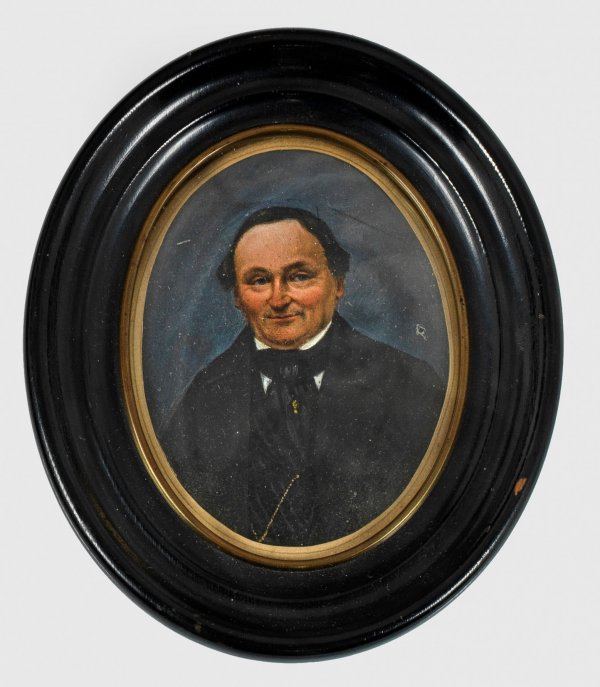 Ovales Hüftbildnis des Herren, bekleidet mit schwarzem Anzug und weißem Hemd vor dunkelgrauem Hintergrund. Ebonisierter Holzrahmen mit Öse und Messingblende. Rückseitig handschriftlich bez., wohl mit Inventarnummer "36". Feine Temperamalerei. 11,5 cm x 9 cm.