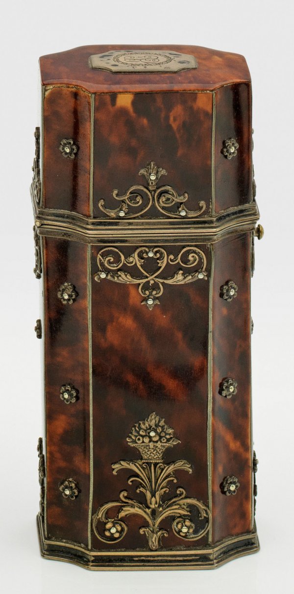 Farbloses Glas und Schildpatt mit Silbermontierung. Hochrechteckiges Etui aus Silber mit eingezogenen Ecken und scharniertem Deckel. Flächendeckend mit Schildpatt belegt und verziert mit applizierten, durchbrochen gearbeiteten, reliefplastischen Blüten und Blattranken. Obenauf eine passig geschweifte Plakette mit gravierten Initialien. Im Etui ein facettiert geschliffener Glasflakon mit scharniertem Silberdeckel. Gest., Beschauzeichen, Jahresbuchstabe "n". H. 14 cm 6 cm x 4 cm.