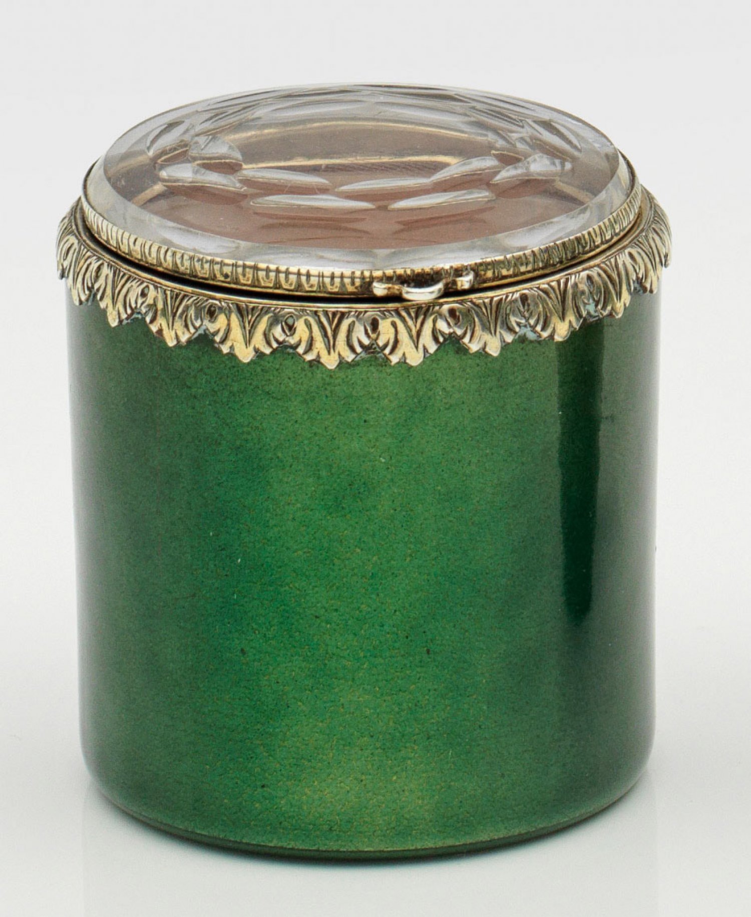 Farbloses Glas und Silbermontierung, teilw. emailliert. Zylindrischer Korpus mit silbergefasstem und scharniertem, facettiert geschliffenem Glasdeckel. Die Silbermontierung in Form eines reliefplastischen Blätterkranzes. Die Wandung umlaufend grün emailliert. Im Inneren ein Fond aus lachsfarbenem Email. Auf der Bodenunterseite bez. "S". H. 5 cm. D. 4,5 cm.