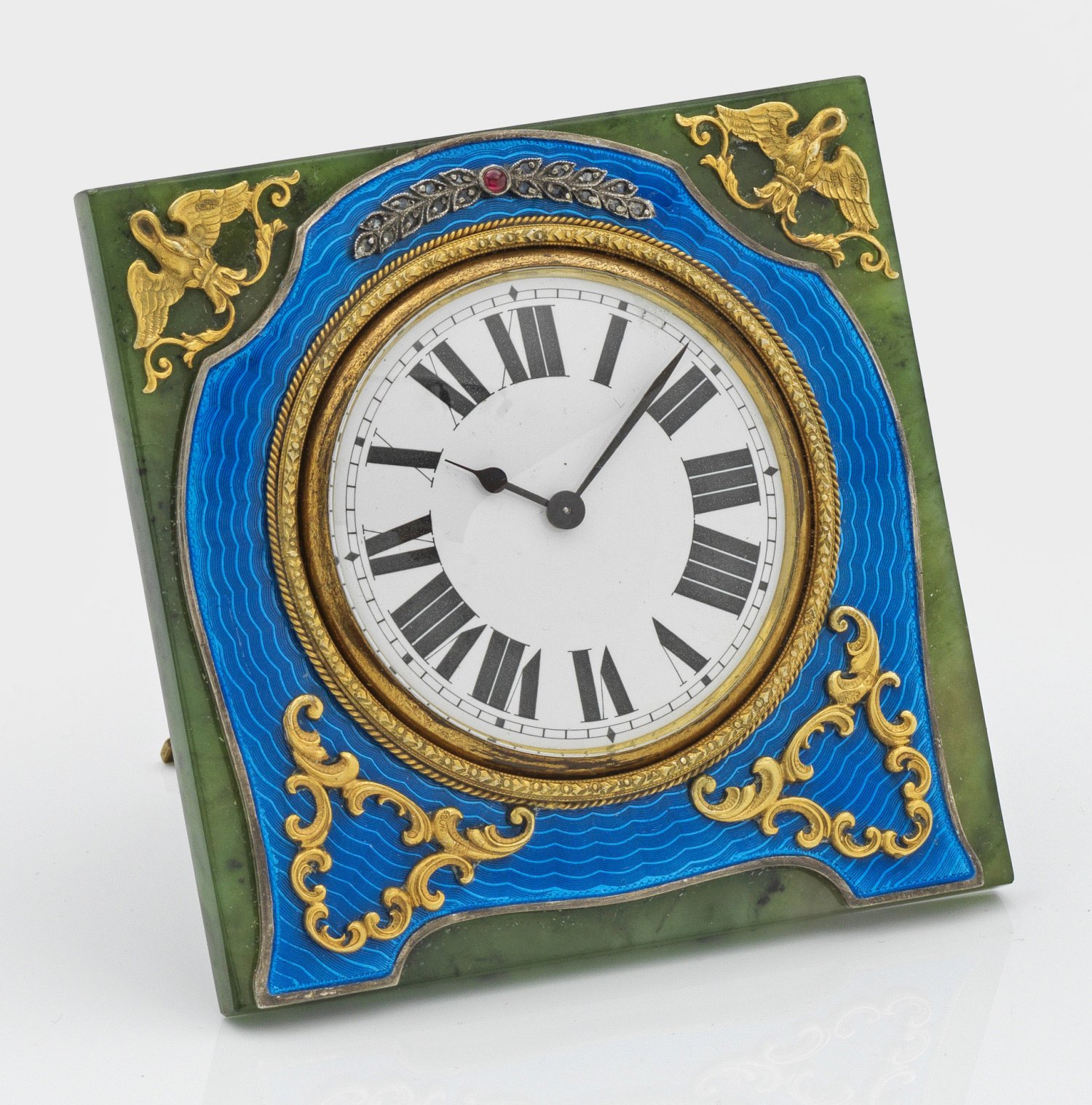 im Stil von Karl Fabergé. Silber, teilw. vergoldet und Nephrit. Quadratische, dunkelgrüne Nephrit-Platte mit eingelassener Uhr, umgeben von breitem, blau emailliertem und wellenförmig guillochiertem Rahmen in Form einer Standuhr. Goldene Lünette und weißes Zifferblatt mit schwarzen, römischen Zahlen. Breite Rahmung, verziert mit Applikationen in Form von stilisierten Schwänen, Blattzweig und durchbrochen gearbeiteten Voluten. Rückseitig aufstellbar. Gest. 88. 9,3 cm x 9,3 cm.