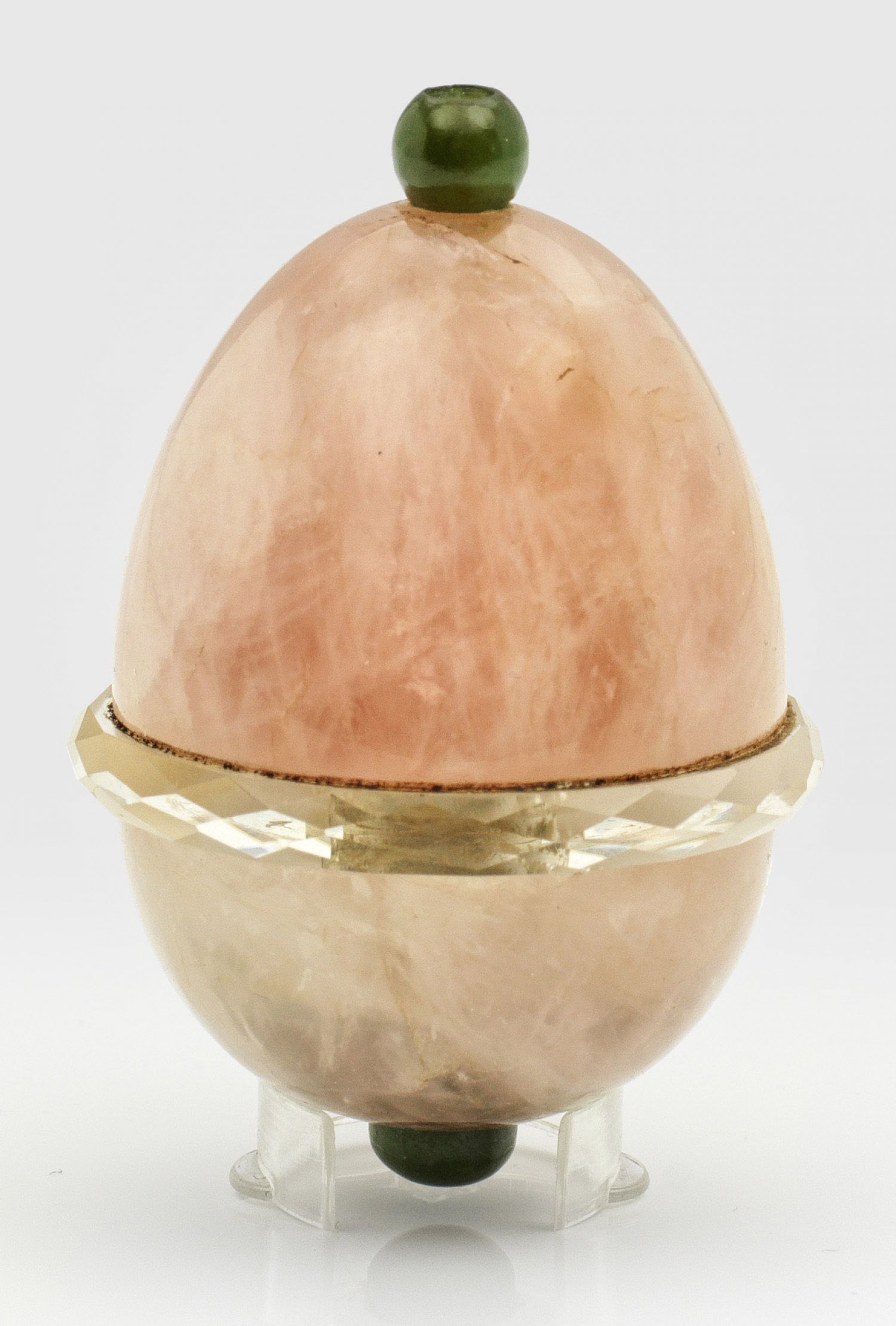 Rosenquarz, Bergkristall und Nephrit. Ovoide Form, unterteilt durch mittig umlaufenden, facettiert geschliffenen Kranz aus Bergkristall. Oben ein Druckknopf und unten die Fassung für ein Kabel aus Nephrit. Minim. besch., Kabel fehlt. H. 6,5 cm.