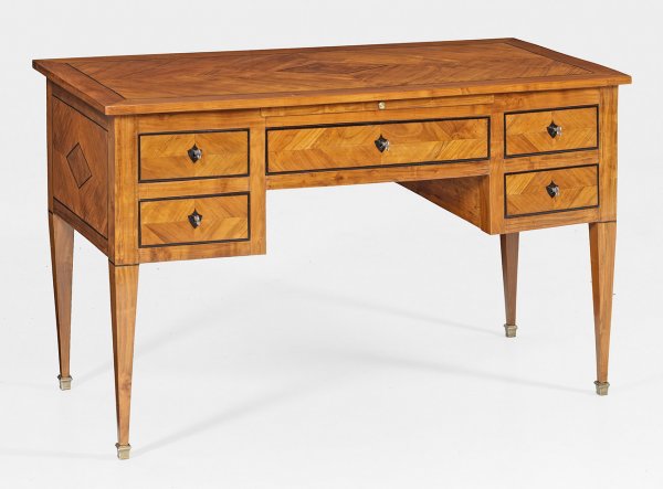 Kirschbaum, furniert. Gerader, rechteckiger Korpus auf konischen Vierkantbeinen. In der gegliederten Front gekantetes Kniefach, umgeben von fünf Schubladen unterschiedlicher Größe und ausziehbare Ablagefläche sowie rückseitig entsprechende Blendschubladen. Allseitig gespiegelt angeordnete Furnierfelder. H. 79,5 cm. 132 cm x 62 cm.