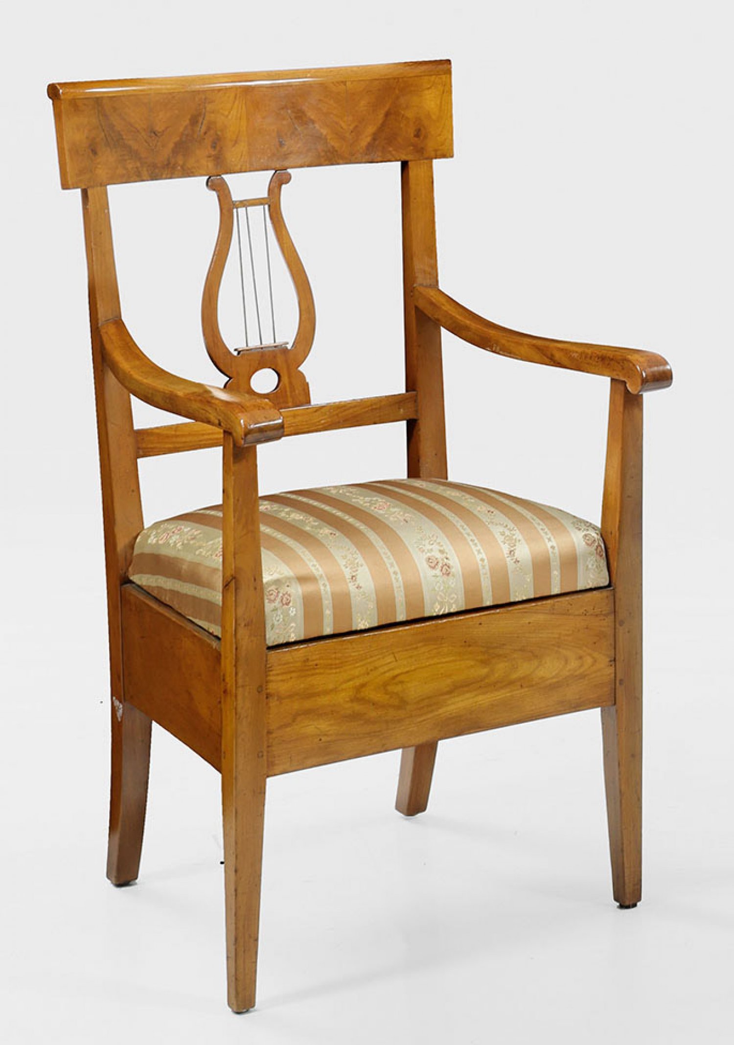 Kirschbaum, massiv und furniert. Trapezförmige Zarge auf konischen Beinen, in Stützen für Armlehnen übergehend. Rechteckige Rückenlehnenrahmung mit lyraförmigem Mittelsteg sowie breitem oberen Abschluss. H. 100 cm. 57 cm x 54 cm. Sitz-H. 46 cm.