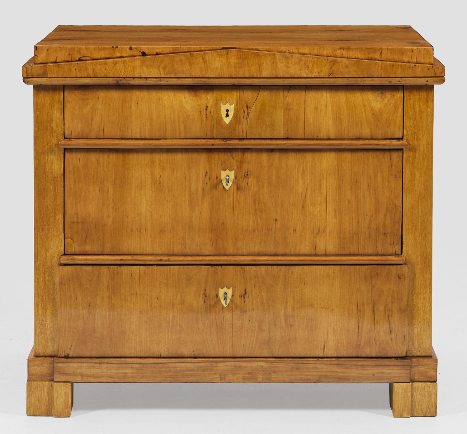 Obstholz, furniert. Gerader, rechteckiger Korpus auf schmaler Zarge und gekanteten Füßen. In der gegliederten Front drei Schubladen unterschiedlicher Größe. Gestuft ansteigende Deckplatte mit flachem Schinkelgiebel. H. 84 cm. 94 cm x 49 cm.