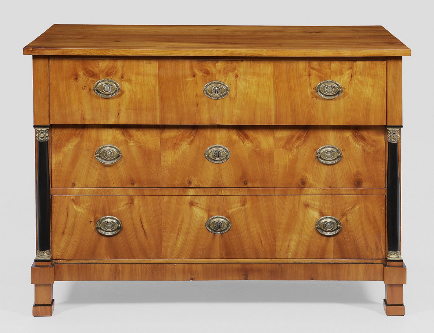 Kirschbaum, furniert sowie teilw. ebonisiert. Gerader, querrechteckiger Korpus auf gekanteten Füßen. In der gegliederten Front drei breite, teilw. vorkragende Schubladen, flankiert von eingestellten Halbsäulen. Gering überstehende Deckplatte. H. 84 cm. 120 cm x 59,5 cm.