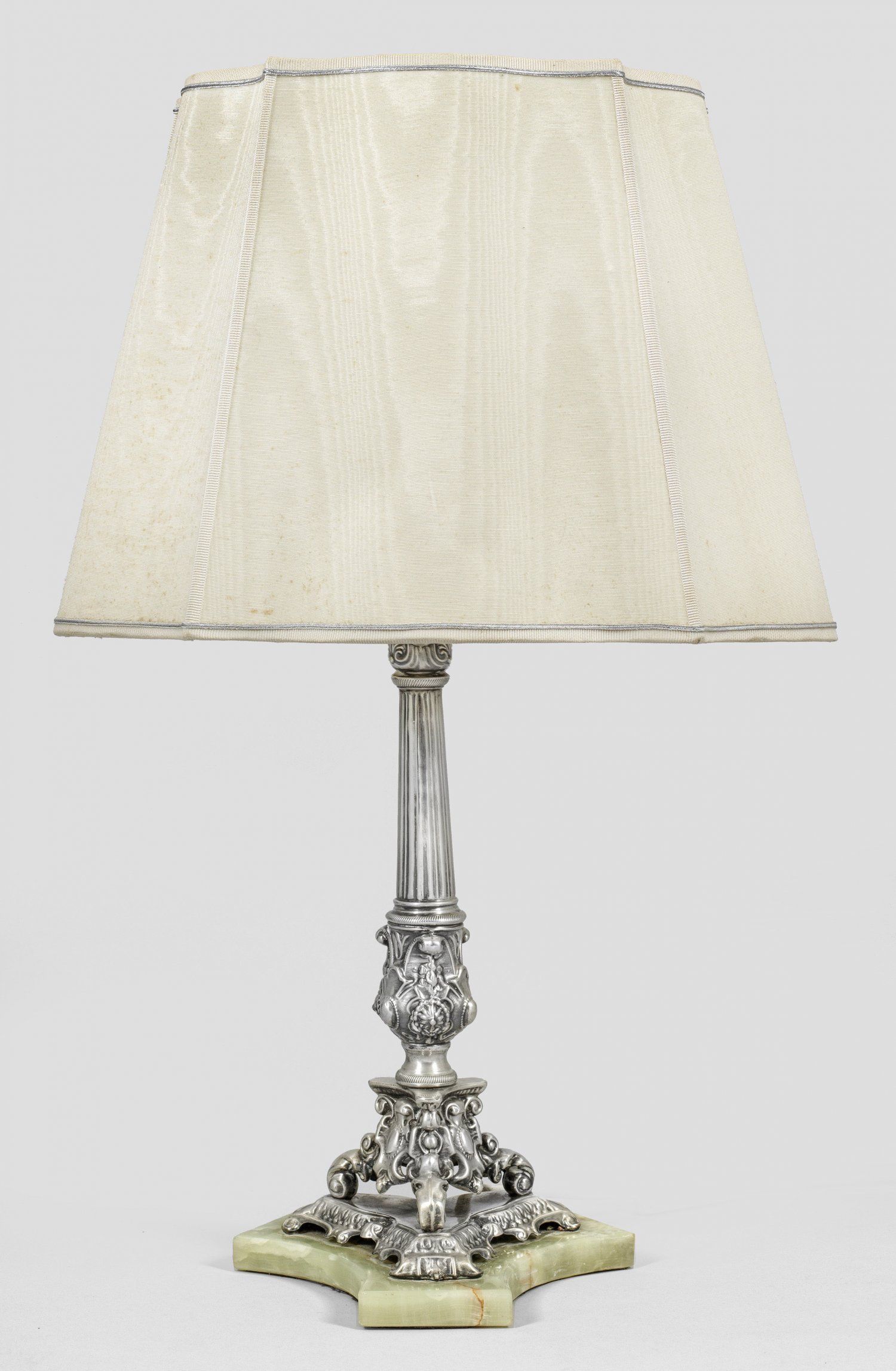 1-flg.; Silber und hellgrüner und cremefarben gemaserter Onyx. Über dreiseitig konkav eingezogener Plinthe durchbrochen gearbeiteter Sockel aus Volutenmotiven und großen Kartuschen auf blattreliefierter Basis. Oberhalb davon ausgehend mehrfach gegliederter, kannelierter und sich konisch verjüngender Balusterschaft als Träger für Leuchtmittel. Passig geschweifter Lampenschirm. Elektrifiziert. Gest. 800. H. 67 cm.