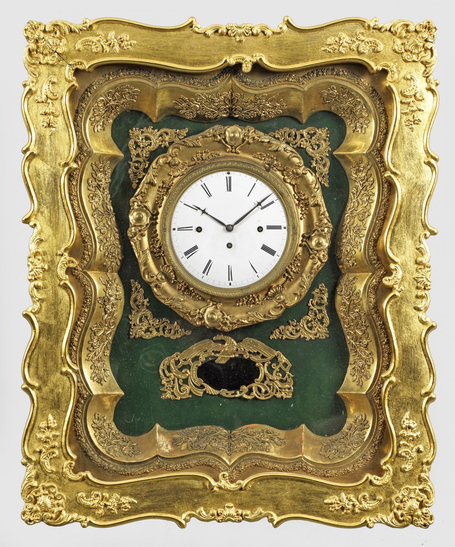 Holz, stuckiert, dunkelgrün gefasst bzw. vergoldet sowie Applikationen aus Messing. Passig geschweifte, verglaste Rahmung aus Volutenmotiven. Breit gerahmtes Emailzifferblatt. Messingwerk mit Viertelstundenschlag auf Tonfeder sowie Repetition. 59 cm x 48 cm.
