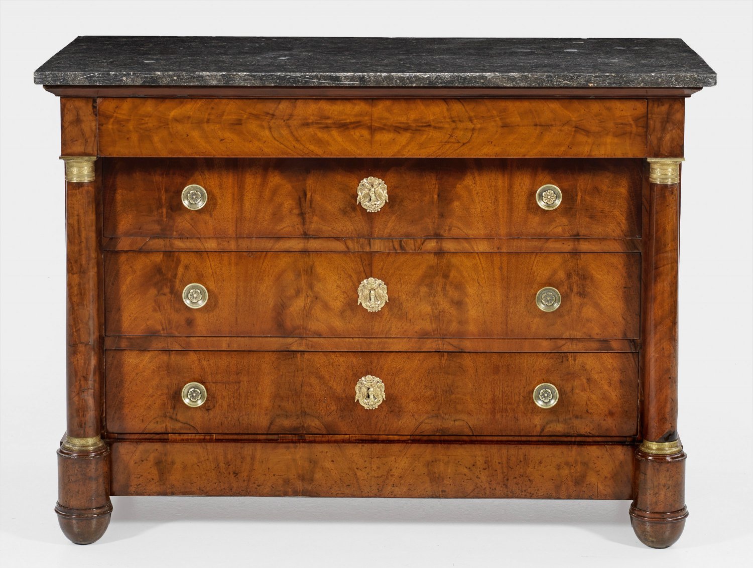 Mahagoni, furniert. Gerader, querrechteckig angelegter Korpus, flankiert von eingestellten Vollsäulen mit reliefierten Basen und Kapitellen auf gerundeten Füßen. In der gegliederten Front vier breite Schubladen unterschiedlicher Größe. Deckplatte aus anthrazitfarbenem Marmor. H. 88 cm. 124 cm x 62 cm.