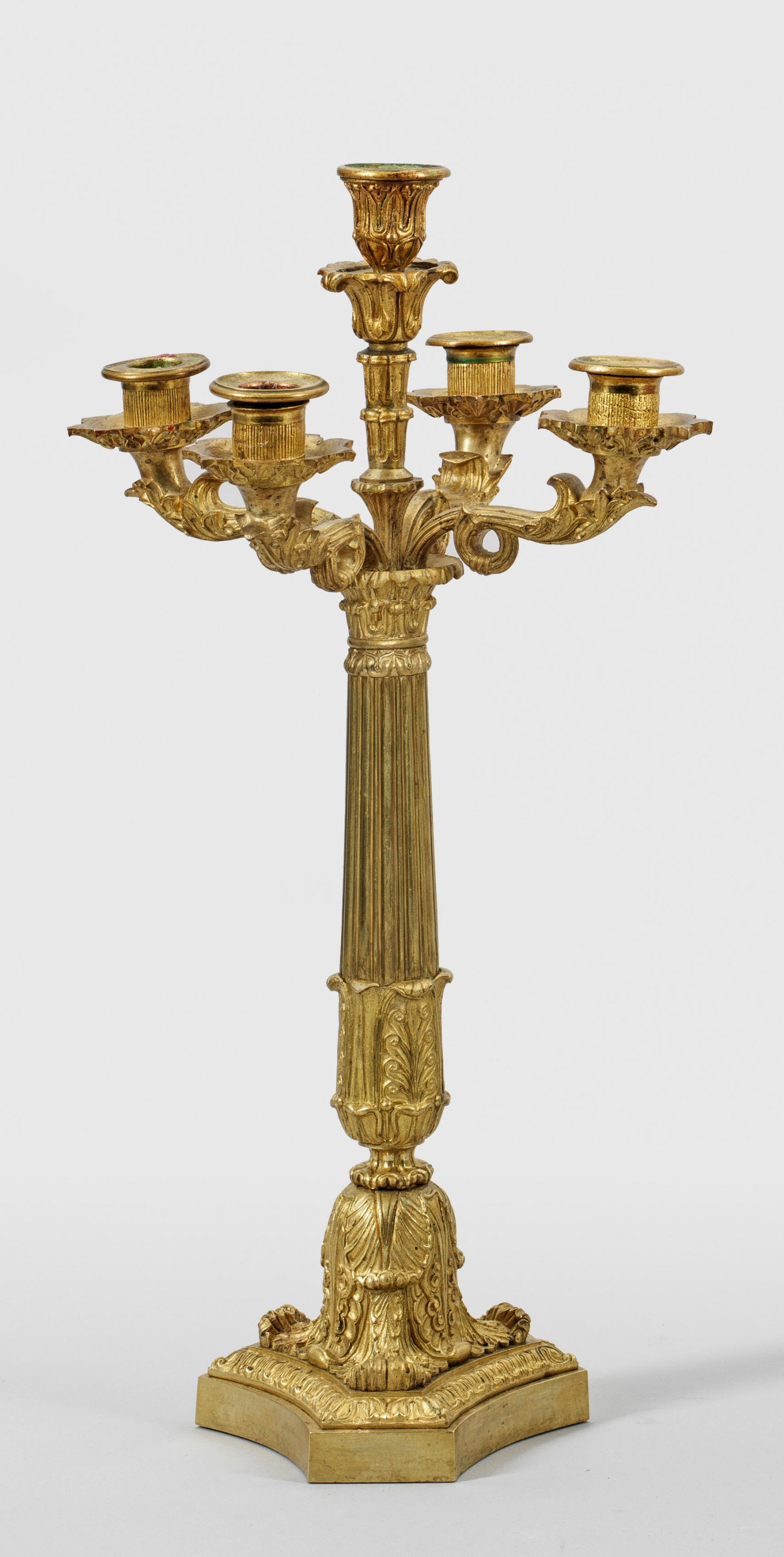 5-flg.; Bronze, vergoldet. über dreiseitig konkav eingezogenem, blattreliefiertem Sockel kannelierter Säulenschaft mit üppigen Palmetten. Oberhalb davon ausgehend geschwungene Leuchterarme mit vasenförmigen Tüllen. H. 47 cm.