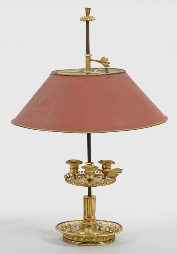 3-flg.; Messing und rot lackiertes Blech. Über durchbrochen gearbeitetem Stand mit breitem Palmettenfries kurzer, kannelierter Säulenschaft. Oberhalb schmaler, gekanteter Schaft für höhenverstellbares Tondo aus Volutenmotiven mit vasenförmigen Tüllen sowie höhenverstellbarer Lampenschirm. H. 62,5 cm.