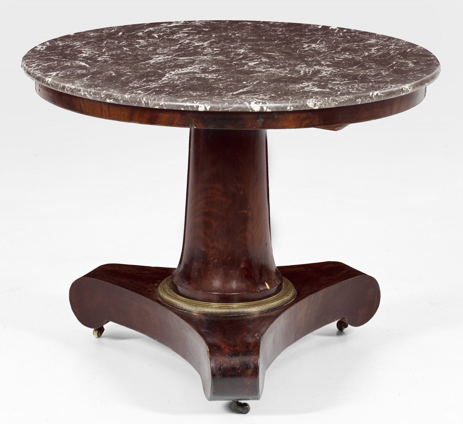 Mahagoni, furniert. Über dreiseitig konkav eingezogener Sockelplatte mit Rollen sich konisch verjüngender Schaft als Träger für bombierte Zarge. Gering überstehende, runde Deckplatte aus dunkelgrauem, hellgrau gemasertem Marmor. H. 75 cm. D. 98 cm.