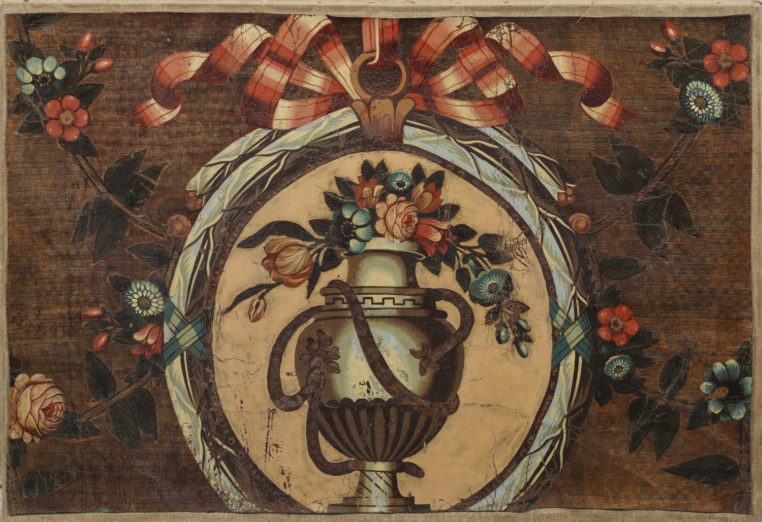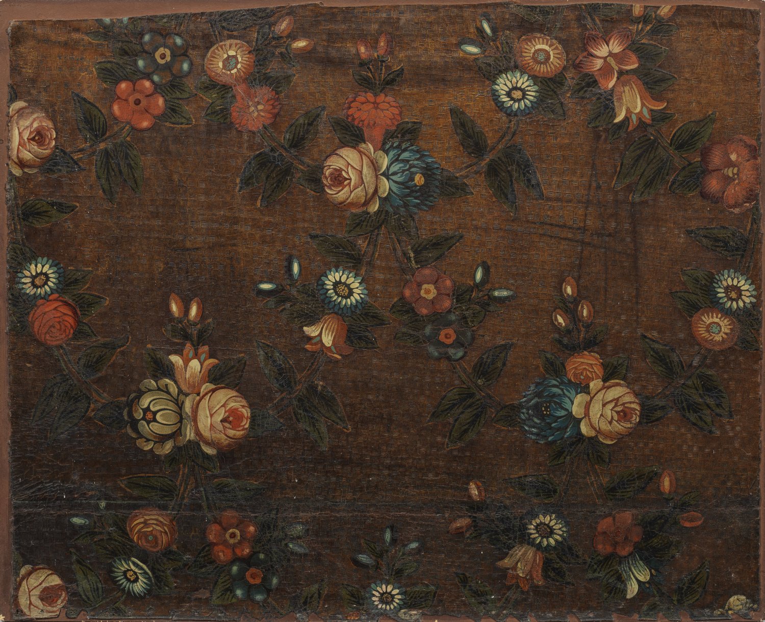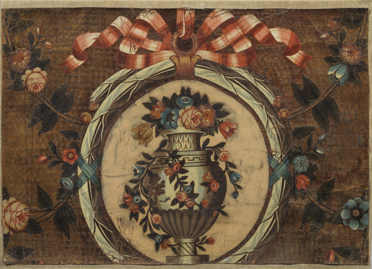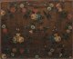 Geprägtes Leder, Goldfond und farbig bemalt. Flächendeckender, floraler Dekor aus schleifenbekrönten Medaillons mit Amphorenvasen bzw. Blütengirlanden. Aufgezogen, unw. besch.; 50 cm-62 cm x 74 cm-76 cm.