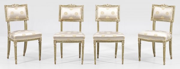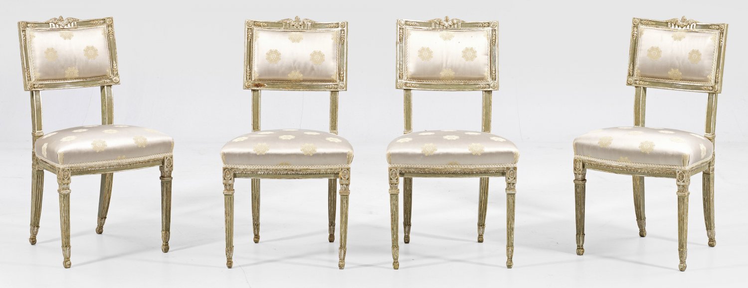 A set of four Swedish grey-green coloured and partly silver painted Louis XVI chairs.