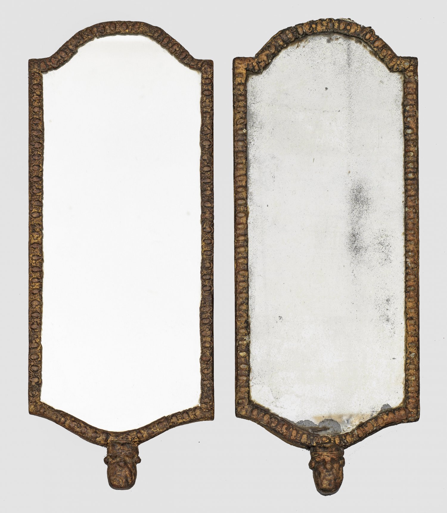 Holz mit Bleiapplikationen, gefasst. Hochrechteckige Spiegelrahmung, schmaler Eierstabfries mit segmentförmigem oberen und unteren Abschluss. Unterhalb reliefiertes Maskaron. 44 cm x 16,5 cm.
