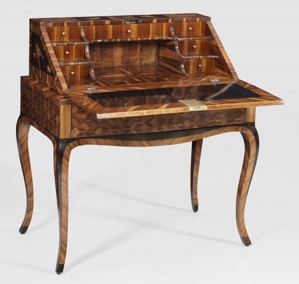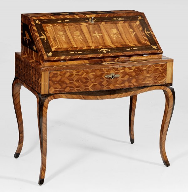 Pflaumenholz, furniert sowie Einlagen aus unterschiedlichen Edelhölzern. Gerader, einschübiger, in der Front bombierter Zargenkasten auf geschwungenen Beinen. Zurückgesetzter Aufsatz mit schräggestellter, aufklappbarer Arbeitsplatte. Dahinter gestaffelte Facheinteilung. Flächendeckend breit gerahmte Furnierfelder sowie eingelegte Blüten, Vögel und Wildtiere. H. 98 cm. 89 cm x 50 cm.