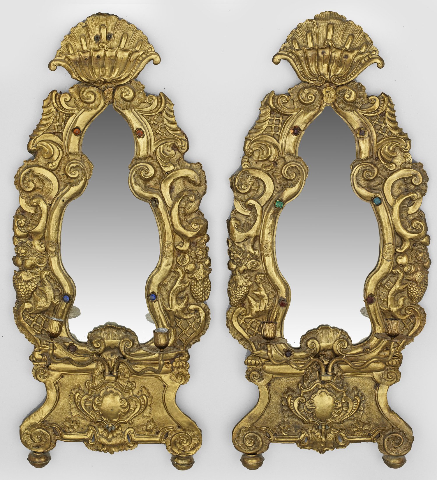 2-flg.; Messingblech auf Holzkern. Über reliefierten, eingerollten Voluten gestreckte kartuschenförmige Spiegelrahmung aus Voluten und reliefierten Früchten mit applizierten, farbigen Glassteinen. Geschwungene Leuchterarme mit vasenförmigen Tüllen. Unw. besch.; H. 95 cm.