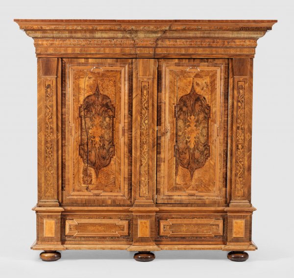Nussbaum und Nussbaummaser, auf Eichenholz furniert. Gerader, querrechteckig angelegter Korpus auf profiliertem Zargensockel und gedrücken Füßen. In der gegliederten Front zwei große Türen mit profilierten Füllungen, flankiert von konischem Pilastern mit intarsierten Blattranken. Stark vorkragendes Profilgesims. Flächendeckend breit gerahmte Furnierfelder, von Bandeinlagen begrenzt. Restaurierungsbedürftig. H. 208 cm. 227 cm x 89 cm.