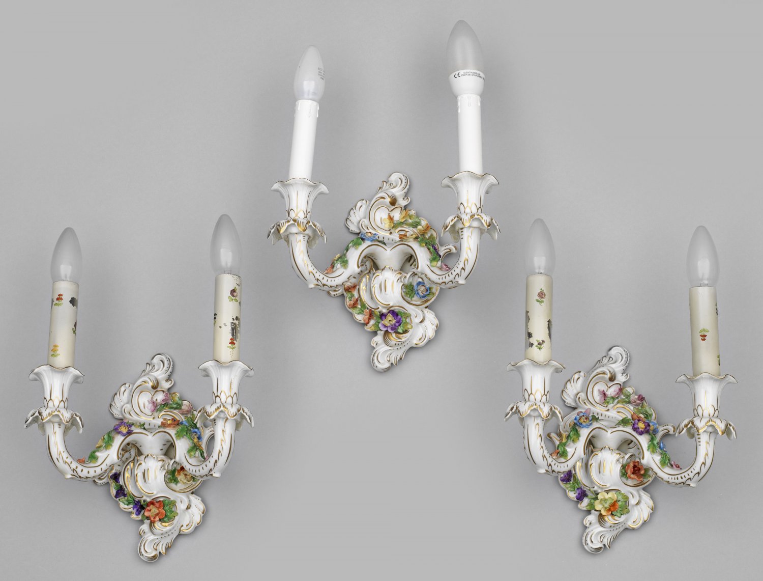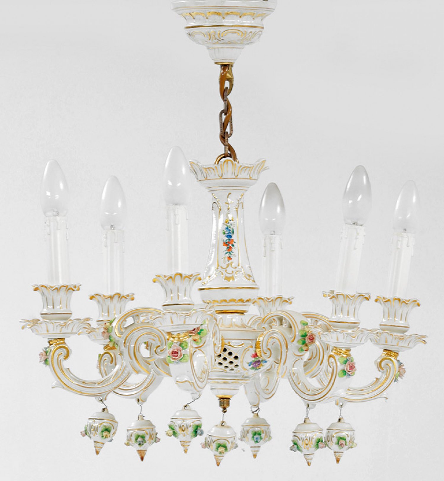 6-flg. bzw. 2-flg.; Porzellan, teilw. polychrom bemalt bzw. vergoldet. Gegliederter, teilw. durchbrochen gearbeiteter Balusterschaft als Träger für stark geschwungene Leuchterarme mit vasenförmigen Tüllen. Kuppelartiger Plafon. Korrespondierende Appliken mit kartuschenförmigem Wandschild. Teilw. gem.; Teilw. rest.; Lampe Ges.-H. 57 cm, D. 49 cm. Appliken-H. 36 cm.