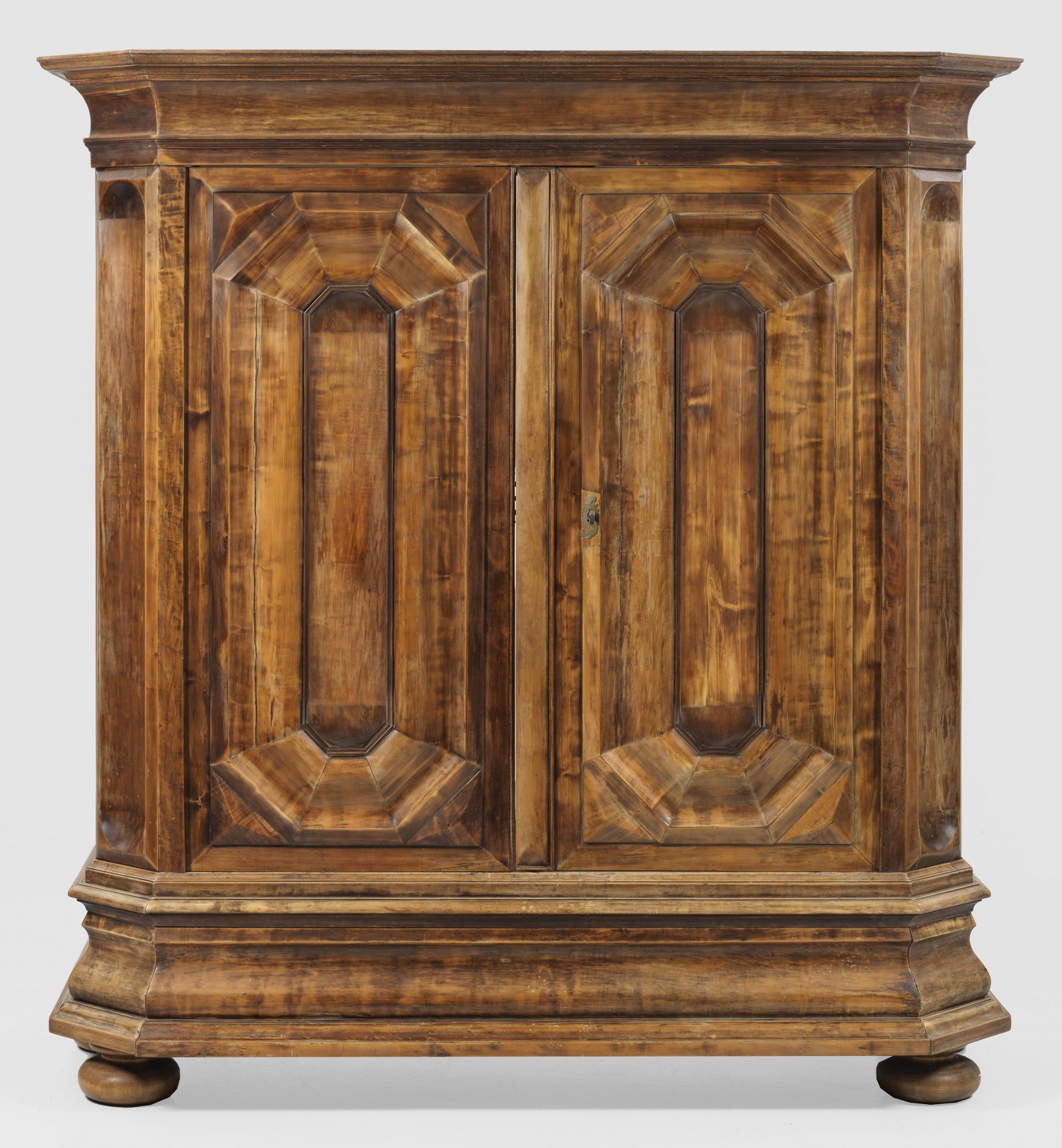 Nussbaum, furniert. Gerader, rechteckiger Korpus, flankiert von breiten, schräggestellten und tief gemuldeten Ecklisenen auf Profilsockel und gedrückten Füßen. In der gegliederten Front zwei Türen mit breit gewulsteten, kissenartigen Füllungen. Vorkragendes Profilgesims. Altersspuren. H. 215 cm. 205 cm x 74 cm.