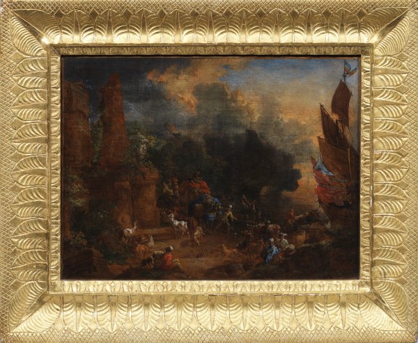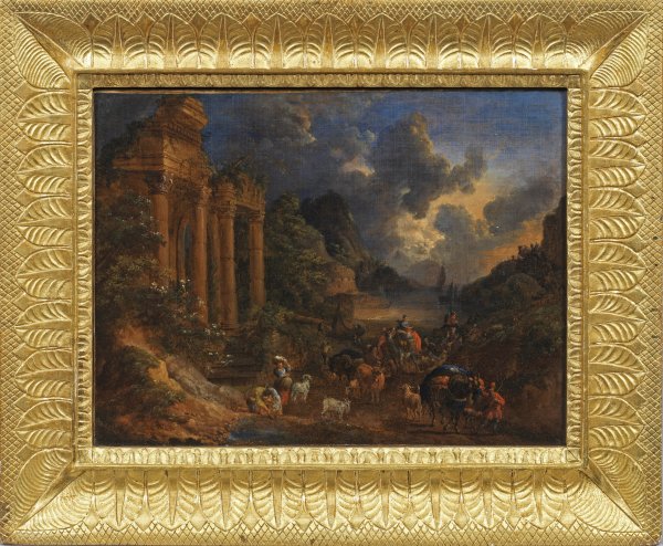 Blick auf abendlich gestimmte, atmosphärische, mediterrane Cappriccios von Hafenbuchten, die jeweils auf der linken Seite durch antike Ruinenarchitektur flankiert werden, während auf der rechten Seite der weite Blick zum Meer mit Schiffen geht. Der Vordergrund ist bei beiden Gemälden durch eine reiche, phantasiereiche, vielfigurige Staffage aus ruhenden Hirten bzw. Kauffahrteiszenen belebt, bei der Reiter, Händler und schwer bepackte Lasttiere geschildert werden. Hendrik van Minderhout lebte ab 1652 in Brügge, anschließend von 1672 bis zu seinem Tod in Antwerpen, wo er jeweils Mitglied der örtlichen Lukassgilden wurde. Möglicherweise unternahm er 1653 eine Italien-Reise. Außer Seeschlachten und realistischen Veduten (u. a. der Häfen von Antwerpen und Brügge) malte er mit Vorliebe imaginäre Ansichten von Mittelmeer- und orientalischen Häfen, zu denen auch dieses Gemäldepaar gehört. Beispielsweise schenkte Minderhout der Antwerpener Malergilde eine große Ansicht eines orientalischen Hafens, um von Zunftgebühren befreit zu werden. Werke des Malers befinden sich u. a. in Museen in Antwerpen, Brügge, Oslo und Rouen. Öl/Lwd., doubl.; L. u. monogr. bzw. r. u. sign.; 28 cm x 38,5 cm. Rahmen.