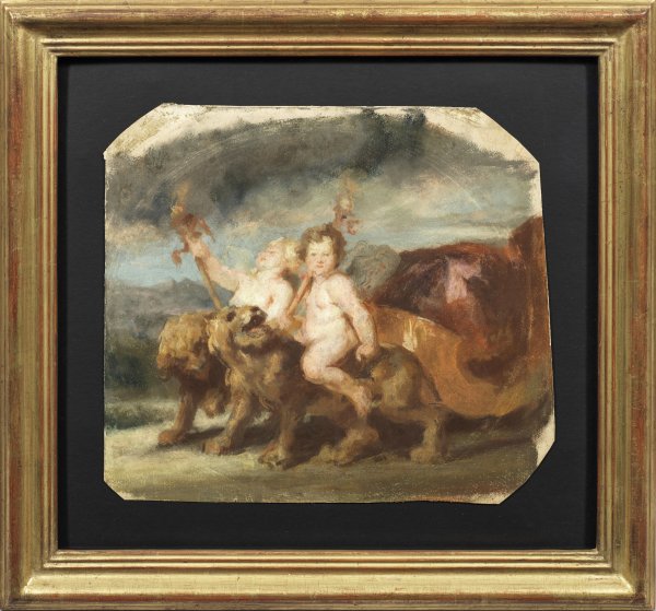 Mit weichem, pastelltonigem Kolorit gemalte Darstellung. Die an Rubens erinnernde barocke Fülle weist auf den Umkreis Hans Makarts hin, in Frage kommt als Maler möglicherweise sein Zeitgenosse Hans Canon (1829 - 1885). Später wurde das Motiv der auf Panthern reitenden Bacchusknaben um 1900 ein beliebtes Motiv auf Gemälden (u. a. bei Franz von Stuck) und in Porzellangruppen des Jugendstils. Gouache/Karton. Ränder beschnitten. Ca. 29,5 cm x 34 cm. Rahmen.