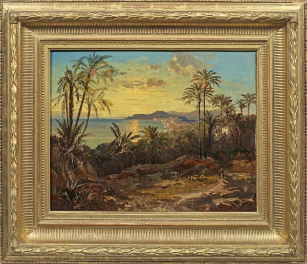 Atmosphärisch gestimmter, in ausdrucksstarker Farbigkeit in die Abendstimmung gesetzter Blick über die Bucht von Menton an der französischen Riviera mit Sicht auf den Felsen von Monaco. Johann Jacob Frey, der Sohn des Malers und Radierers Samuel Frey studierte bei Hieronymus Hess in Basel und ging anschließend nach Paris. Nach 1834 wurde ihm durch eine weibliche Mäzenin eine Studienreise nach Italien und Spanien ermöglicht, in Rom fand er künstlerische Vorbilder in den Landschaften von Claude Lorrain und Nicolas Poussin. Er wurde dort schließlich auch sesshaft, heiratete und gehörte zu den Gründern des Deutschen Künstlervereins vor Ort. In Rom besuchte ihn auch Friedrich Willhelm IV. von Preußen, für den er eine Folge italienischer Landschaften malte, die sich heute im Marmorpalais in Potsdam befinden. Seine Werke sind vertreten in Privatsammlungen in Basel und in den Museen in Danzig, Leipzig und München sowie in königlich Württembergischen Besitz. Öl/Papier/Karton. Rest. Rückseitig bez. und Aufkleber mit Siegelmarke "L mit Krone". Ca. 31 cm x 40 cm. Rahmen.