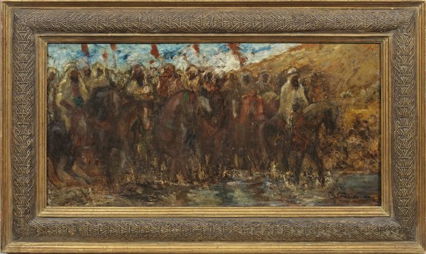 Impressionistisches Orientbild des auf Reiter und Schlachten spezialisierten Malers. Faur lernte bei Studienaufenthalten in Paris u. a. die Werke von Delacroix, Courbet und Monticelli kennen, überdies studierte er an der Münchener Akademie bei Carl Theodor von Piloty. 1883 unternahm er eine Reise nach Marokko, wo ihn das Licht, die Landschaft und die beduinischen Reiterstämme faszinierten; dies prägte seine künstlerische Entwicklung zu einem freien, effektvollen Kolorismus. Öl/Mahagonitafel. R. u. sign.; 24,5 cm x 50 cm. Rahmen.